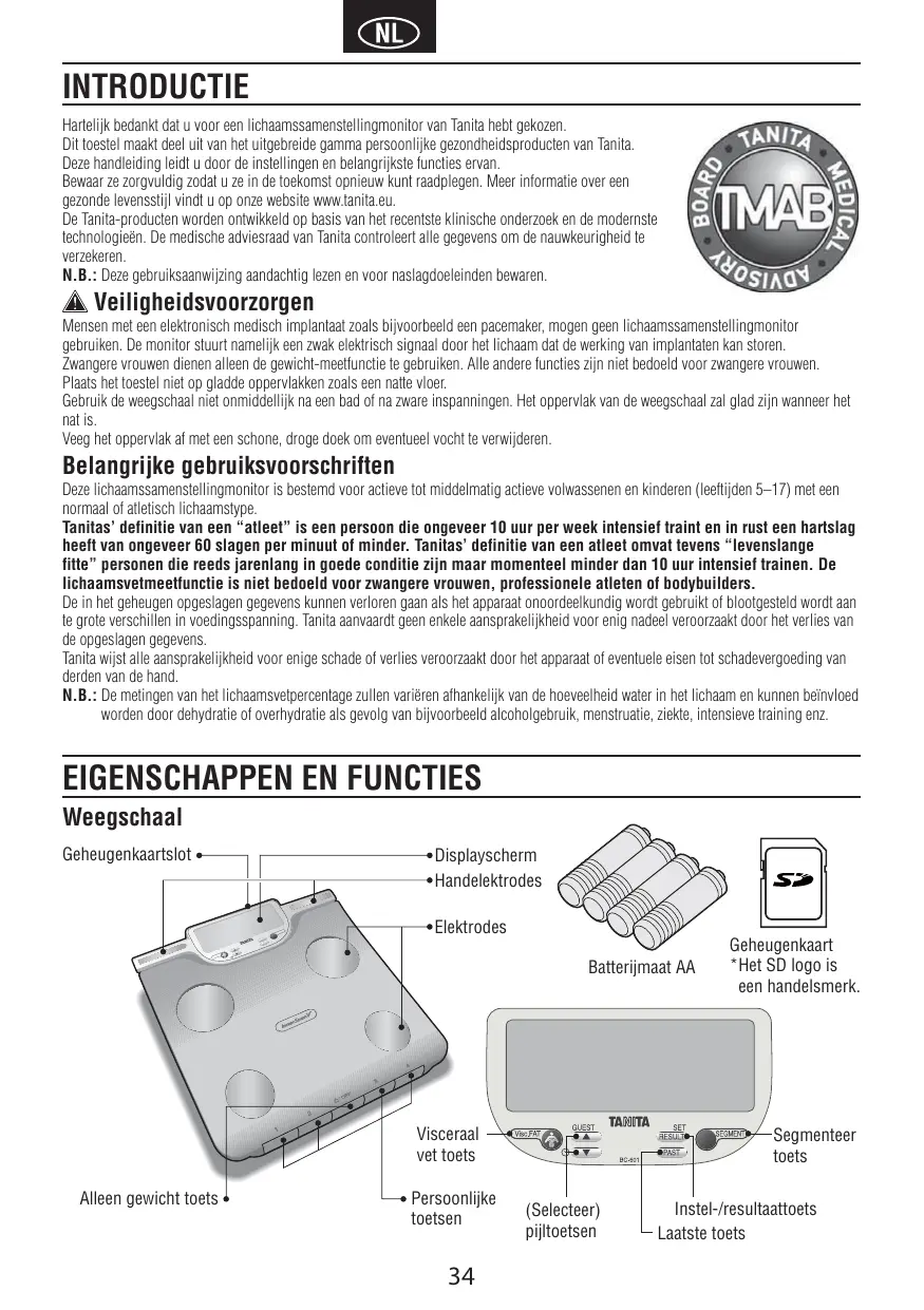 INTRODUCTIE Hartelijk bedankt dat u voor een lichaamssamenstellingmonitor van Tanita hebt gekozen. Dit toestel maakt deel uit van het uitgebreide gamma persoonlijke gezondheidsproducten van Tanita. Deze handleiding leidt u door de instellingen en belangrijkste functies ervan. Bewaar ze zorgvuldig zodat u ze in de toekomst opnieuw kunt raadplegen. Meer informatie over een gezonde levensstijl vindt u op onze website www.tanita.eu. De Tanita-producten worden ontwikkeld op basis van het recentste klinische onderzoek en de modernste technologieën. De medische adviesraad van Tanita controleert alle gegevens om de nauwkeurigheid te verzekeren. N.B.: Deze gebruiksaanwijzing aandachtig lezen en voor naslagdoeleinden bewaren. Veiligheidsvoorzorgen Mensen met een elektronisch medisch implantaat zoals bijvoorbeeld een pacemaker, mogen geen lichaamssamenstellingmonitor gebruiken. De monitor stuurt namelijk een zwak elektrisch signaal door het lichaam dat de werking van implantaten kan storen. Zwangere vrouwen dienen alleen de gewicht-meetfunctie te gebruiken. Alle andere functies zijn niet bedoeld voor zwangere vrouwen. Plaats het toestel niet op gladde oppervlakken zoals een natte vloer. Gebruik de weegschaal niet onmiddellijk na een bad of na zware inspanningen. Het oppervlak van de weegschaal zal glad zijn wanneer het nat is. Veeg het oppervlak af met een schone, droge doek om eventueel vocht te verwijderen. Belangrijke gebruiksvoorschriften Deze lichaamssamenstellingmonitor is bestemd voor actieve tot middelmatig actieve volwassenen en kinderen (leeftijden 5–17) met een normaal of atletisch lichaamstype. Tanitas’ definitie van een “atleet” is een persoon die ongeveer 10 uur per week intensief traint en in rust een hartslag heeft van ongeveer 60 slagen per minuut of minder. Tanitas’ definitie van een atleet omvat tevens “levenslange fitte” personen die reeds jarenlang in goede conditie zijn maar momenteel minder dan 10 uur intensief trainen. De lichaamsvetmeetfunctie is niet bedoeld voor zwangere vrouwen, professionele atleten of bodybuilders. De in het geheugen opgeslagen gegevens kunnen verloren gaan als het apparaat onoordeelkundig wordt gebruikt of blootgesteld wordt aan te grote verschillen in voedingsspanning. Tanita aanvaardt geen enkele aansprakelijkheid voor enig nadeel veroorzaakt door het verlies van de opgeslagen gegevens. Tanita wijst alle aansprakelijkheid voor enige schade of verlies veroorzaakt door het apparaat of eventuele eisen tot schadevergoeding van derden van de hand. N.B.: De metingen van het lichaamsvetpercentage zullen variëren afhankelijk van de hoeveelheid water in het lichaam en kunnen beïnvloed worden door dehydratie of overhydratie als gevolg van bijvoorbeeld alcoholgebruik, menstruatie, ziekte, intensieve training enz.