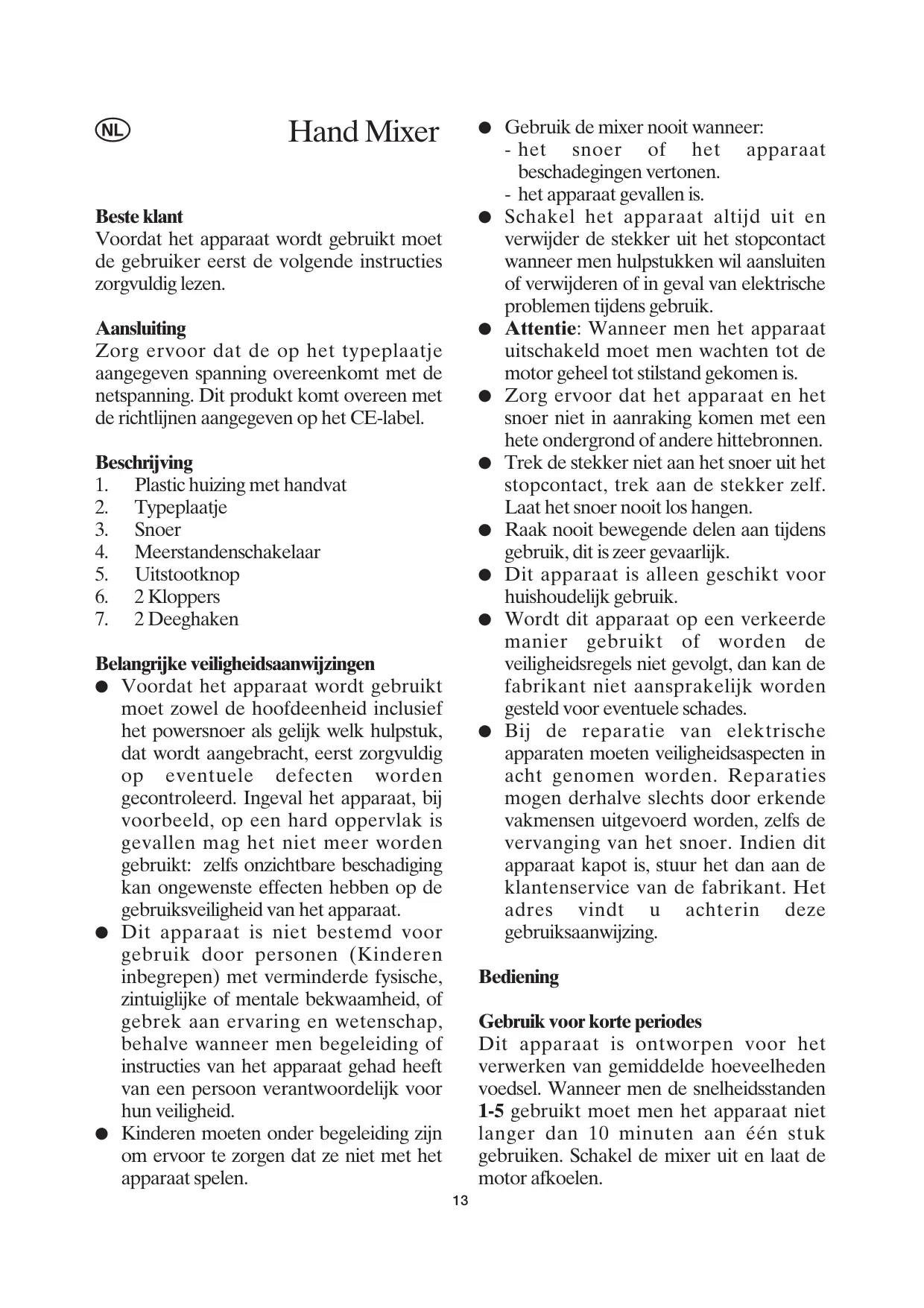 Éteignez toujours le mixeur et débranchez la fiche de la prise murale avant d’attacher ou de retirer un accessoire quelconque et en cas de dysfonctionnement pendant son utilisation. Attention: attendez toujours, après avoir éteint l’appareil, que le moteur se soit complètement arrêté. Ne permettez jamais que l’appareil ou le cordon d’alimentation touchent aucune surface chaude ou entre en contact avec aucune source de chaleur. Pour retirer le cordon de la prise murale, ne tirez jamais dessus mais servez-vous de la fiche. Ne laissez pas pendre le cordon. Ne touchez aucune des parties en mouvement durant le fonctionnement. Cet appareil est destiné à un usage domestique uniquement et non pas à un usage professionnel. Nous déclinons toute responsabilité pour les dommages éventuels subis par cet appareil, résultant d’une utilisation incorrecte ou du non-respect de ce mode d'emploi. Afin de se conformer aux normes de sécurité en vigueur et d’éviter tout risque, la réparation d'appareils électriques, y compris le remplacement d’un cordon d’alimentation, doit être effectuée par un agent qualifié. En cas de panne, envoyez votre appareil à un de nos centres de service après-vente agréés dont vous trouverez la liste en annexe de ce mode d'emploi.