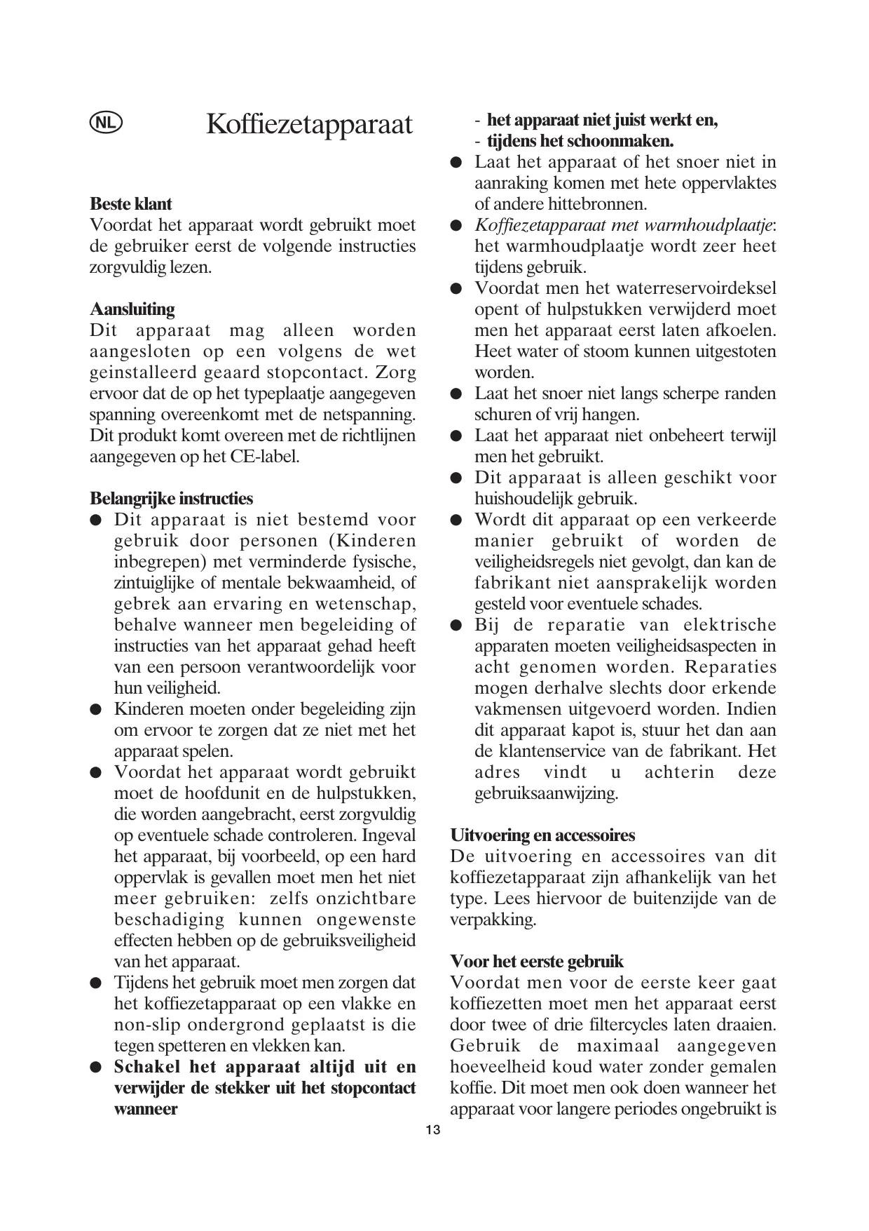 Voordat men voor de eerste keer gaat koffiezetten moet men het apparaat eerst door twee of drie filtercycles laten draaien. Gebruik de maximaal aangegeven hoeveelheid koud water zonder gemalen koffie. Dit moet men ook doen wanneer het apparaat voor langere periodes ongebruikt is