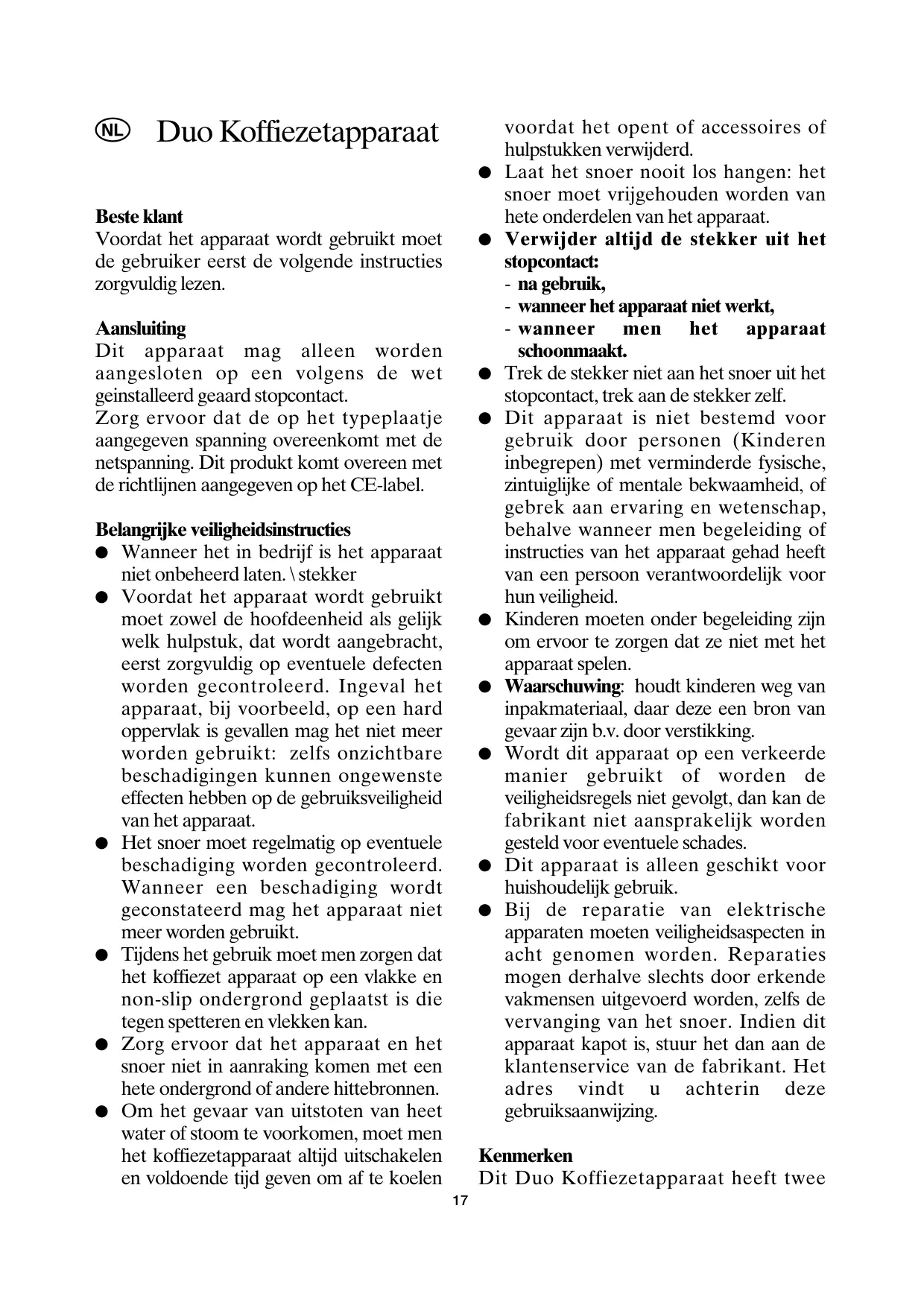 wordt, bestaat het gevaar dat de binnenfles implodeerd vanwege het vacuum. Dit kan heel goed op een later tijdstip gebeuren, zonder dat er een direct aanwijsbare reden is. e Drink daarom nooit direct uit of plaats uw hand in de karaf. Sluit de karaf altijd af met de deksel. De koffie kan zonder de deksel te verwijderen ingeschonken worden. Om in te schenken draait u de dop linksom zonder dat men deze verwijderd. Laat de thermische karaf nooit onbeheerd in de buurt van kinderen staan.