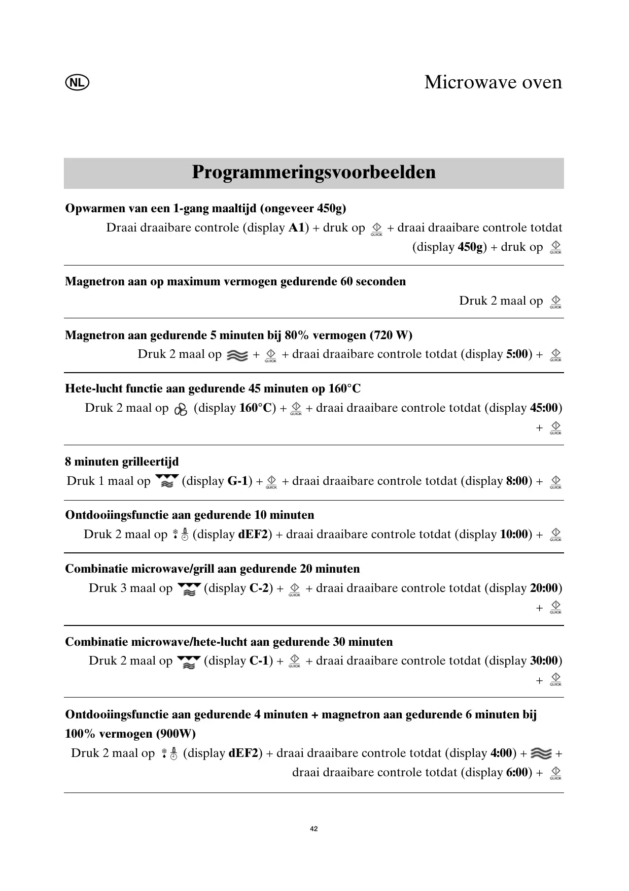 - Après leur sortie du congélateur, les aliments conservés en conteneurs en plastique ou enveloppés dans du film en plastique doivent reposer quelque temps à température ambiante. Attendez que les aliments soient facilement détachables du film ou des parois du conteneur avant de les mettre au four dans un récipient pouvant passer au four à micro-ondes. 1. Appuyez une ou deux fois sur ; l'écran affiche ‘dEF1’ ou ‘dEF2’ et les symboles et . 2. A l'aide de la commande, sélectionnez le poids des aliments à décongeler (entre 100 g et 2000 g), ou le temps de décongélation (entre 00:05 et 95:00). 3. Appuyez sur pour démarrer la décongélation; l'appareil émet un signal sonore et les symboles et clignotent à l'écran. Programme rapide Les temps de cuisson les plus utilisés peuvent être affichés en appuyant simplement sur la touche . Avec cette fonction, la puissance du micro-ondes est toujours préréglée sur 100%. Chaque pression sur la touche augmente le temps de cuisson de 30 secondes. Remarque : la cuisson commence dès la première pression sur la touche. Exemple : pour programmer la fonction micro-ondes pour un temps de cuisson de 2 minutes à 100% de la puissance. 1. Appuyez 4 fois sur . L'écran affiche 2:00, et le symbole clignote. Programmes de cuisson automatiques Ces programmes de cuisson automatiques sont pratiques pour cuire les aliments sans devoir spécialement programmer, par exemple, le temps de cuisson ou la puissance. Au démarrage d'un programme, la fonction en cours est signalée par le symbole correspondant affiché à l'écran (ex. pour micro-ondes). 1. A l'aide de la commande, sélectionnez le programme désiré. L'écran affiche le symbole correspondant au programme et ‘Auto’, et le code du programme ‘A-1’ se met à clignoter. 2. Appuyez sur pour confirmer la sélection. 3. A l'aide de la commande, sélectionnez le poids des aliments. 4. Appuyez sur pour démarrer le programme. Remarque : Le menu ‘A-8’ (Gâteaux) utilise la fonction chaleur tournante. L'appareil se met d'abord en préchauffage pour atteindre 160 degrés puis commence automatiquement le programme de cuisson. Une fois le préchauffage terminé, l'appareil émet deux signaux sonores et l'affichage de la température se met à clignoter. Placez le gâteau dans le four puis appuyez sur la touche pour démarrer le programme.