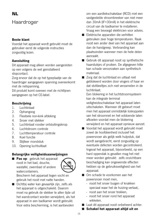 Haardroger Beste klant Voordat het apparaat wordt gebruikt moet de gebruiker eerst de volgende instructies 2orgvuidig lezen: Aansluiting Dit apparaat mag alleen worden aangesloten op een volgens de wet geinstalleerd stopcontact Zorg ervoor dat de op het typeplaatie van de haardroger aangegewen spanning overeenkomt met de netspanning, Dit produkt komt overeen met de richtlinen aangegeven op het CE-abel