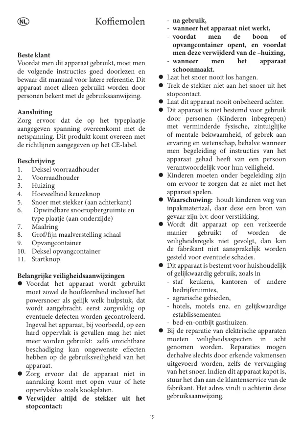 Belangrijke veiligheidsaanwijzingen e Voordat het apparaat wordt gebruikt moet zowel de hoofdeenheid inclusief het powersnoer als gelik welk hulpstuk, dat wordt aangebracht, eerst zorgvuldig op eventuele defecten worden gecontroleerd. Ingeval het apparaat, bij voorbeeld, op een hard opperviak is gevallen mag het niet meer worden gebruikt: zelfs onzichtbare beschadiging kan ongewenste effecten hebben op de gebruiksveiligheïd van het apparaat. Zorg ervoor dat de apparaat niet in aanraking komt met open vuur of hete oppervlaktes zoals kookplaten. Verwijder altijd de stekker uit het stopcontact: = na gebruik, - wanneer het apparaat niet werkt, - voordat men de boon of opvangcontainer opent, en voordat men deze verwijderd van de -huizing, - wanneer men het apparaat schoonmaakt. Laat het snoer nooît los hangen. Trek de stekker niet aan het snoer uit het stopcontact. Laat dit apparaat nooit onbeheerd achter. Dit apparaat is niet bestemd voor gebruik door personen (Kinderen_inbegrepen) met verminderde fysische, zintuiglijke of mentale bekwaamheid, of gebrek aan ervaring en wetenschap, behalve wanneer men begeleiding of instructies van het apparaat gehad heeft van een person verantwoordelik voor hun veiligheid. Kinderen moeten onder begeleiding züjn om ervoor te zorgen dat ze niet met het apparaat spelen. Waarschuwing: houdt kinderen weg van inpakmateriaal, daar deze een bron van gevaar zijn bx. door verstikking. Wordt dit apparaat op een verkeerde manier gebruikt of worden de veiligheidsregels niet gevolet, dan kan de fabrikant niet aansprakelik worden gesteld voor eventuele schades. Dit apparaat is bestemt voor huishoudelijk of gelikwaardig gebruik, zoals in - staf keukens, kantoren of andere bedrijfsruimtes, - agrarische gebieden, - hotels, motels enz. en gelikwaardige establissementen = bed-en-ontbijt gasthuizen. Bij de reparatie van elektrische apparaten moeten veiligheidsaspecten in acht genomen worden. Reparaties mogen derhalve slechts door erkende vakmensen uitgevoerd worden, zelfs de vervanging van het snoer, Indien dit apparaat kapot is, stuur het dan aan de klantenservice van de fabrikant, Het adres vindt u achterin deze gebruiksaanwijzing