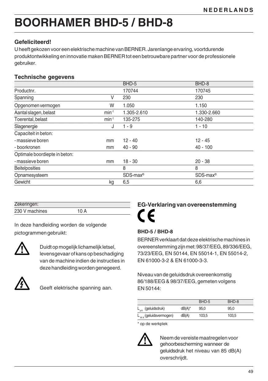 BHD-5 / BHD-8 BERNER verklaart dat deze elektrische machines in overeenstemming zijn met: 98/37/EEG, 89/336/EEG, 73/23/EEG, EN 50144, EN 55014-1, EN 55014-2, EN 61000-3-2 & EN 61000-3-3. Niveau van de geluidsdruk overeenkomstig 86/188/EEG & 98/37/EEG, gemeten volgens EN 50144: BHD-5