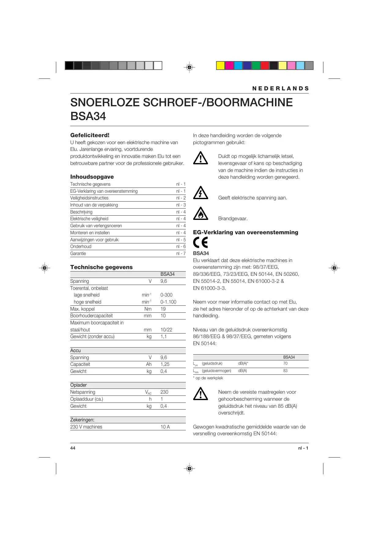 NEDERLANDS SNOERLOZE SCHROEF-/BOORMACHINE BSA34 Gefeliciteerd! U heeft gekozen voor een elektrische machine van Elu. Jarenlange ervaring, voortdurende produktontwikkeling en innovatie maken Elu tot een betrouwbare partner voor de professionele gebruiker.