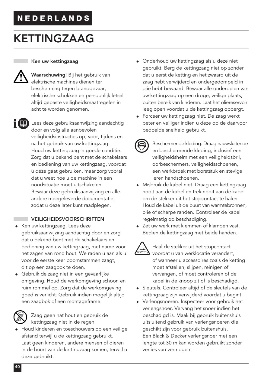 Onderhoud uw kettingzaag als u deze niet gebruikt. Berg de kettingzaag niet op zonder dat u eerst de ketting en het zwaard uit de zaag hebt verwijderd en ondergedompeld in olie hebt bewaard. Bewaar alle onderdelen van uw kettingzaag op een droge, veilige plaats, buiten bereik van kinderen. Laat het oliereservoir leeglopen voordat u de kettingzaag opbergt. Forceer uw kettingzaag niet. De zaag werkt beter en veiliger indien u deze op de daarvoor bedoelde snelheid gebruikt. Beschermende kleding. Draag nauwsluitende en beschermende kleding, inclusief een veiligheidshelm met een veiligheidsbril, oorbeschermers, veiligheidsschoenen, een werkbroek met borststuk en stevige leren handschoenen. Misbruik de kabel niet. Draag een kettingzaag nooit aan de kabel en trek nooit aan de kabel om de stekker uit het stopcontact te halen. Houd de kabel uit de buurt van warmtebronnen, olie of scherpe randen. Controleer de kabel regelmatig op beschadiging. Zet uw werk met klemmen of klampen vast. Bedien de kettingzaag met beide handen. Haal de stekker uit het stopcontact voordat u van werklocatie verandert, of wanneer u accessoires zoals de ketting moet afstellen, slijpen, reinigen of vervangen, of moet controleren of de kabel in de knoop zit of is beschadigd. Sleutels. Controleer altijd of de sleutels van de kettingzaag zijn verwijderd voordat u begint. Verlengsnoeren. Inspecteer voor gebruik het verlengsnoer. Vervang het snoer indien het beschadigd is. Maak bij gebruik buitenshuis uitsluitend gebruik van verlengsnoeren die geschikt zijn voor gebruik buitenshuis. Een Black & Decker verlengsnoer met een lengte tot 30 m kan worden gebruikt zonder verlies van vermogen. NEDERLANDS