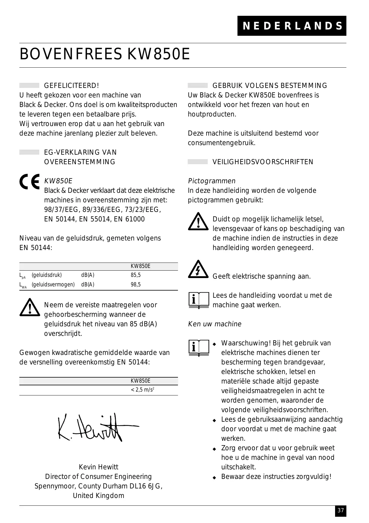 VEILIGHEIDSVOORSCHRIFTEN KW850E Black & Decker verklaart dat deze elektrische machines in overeenstemming zijn met: 98/37/EEG, 89/336/EEG, 73/23/EEG, EN 50144, EN 55014, EN 61000 Niveau van de geluidsdruk, gemeten volgens EN 50144: