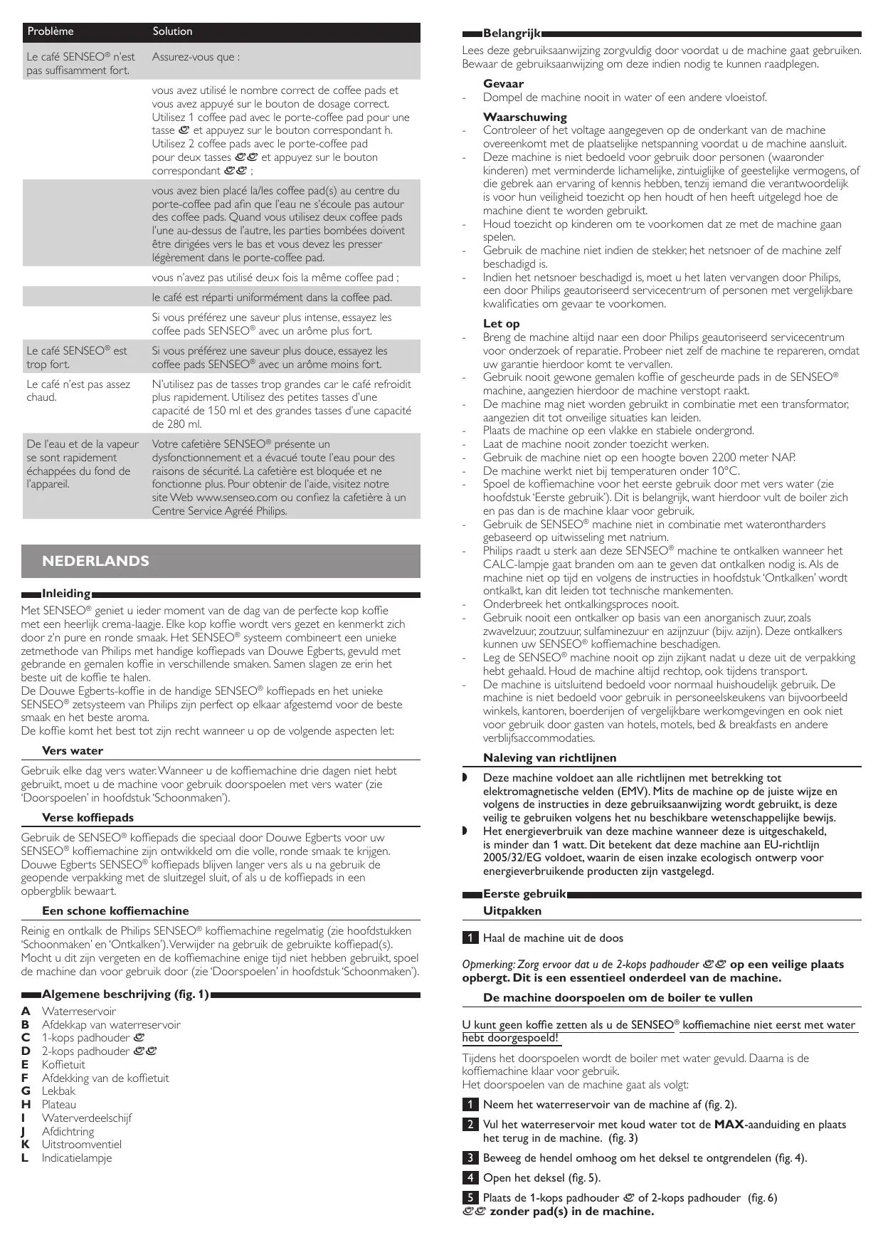 le café est réparti uniformément dans la coffee pad. Si vous préférez une saveur plus intense, essayez les coffee pads SENSEO® avec un arôme plus fort. Le café SENSEO® est trop fort. Si vous préférez une saveur plus douce, essayez les coffee pads SENSEO® avec un arôme moins fort. Le café n’est pas assez chaud. N’utilisez pas de tasses trop grandes car le café refroidit plus rapidement. Utilisez des petites tasses d’une capacité de 150 ml et des grandes tasses d’une capacité de 280 ml. De l’eau et de la vapeur se sont rapidement échappées du fond de l’appareil. Votre cafetière SENSEO® présente un dysfonctionnement et a évacué toute l’eau pour des raisons de sécurité. La cafetière est bloquée et ne fonctionne plus. Pour obtenir de l’aide, visitez notre site Web www.senseo.com ou confiez la cafetière à un Centre Service Agréé Philips. Nederlands Inleiding Met SENSEO® geniet u ieder moment van de dag van de perfecte kop koffie met een heerlijk crema-laagje. Elke kop koffie wordt vers gezet en kenmerkt zich door z’n pure en ronde smaak. Het SENSEO® systeem combineert een unieke zetmethode van Philips met handige koffiepads van Douwe Egberts, gevuld met gebrande en gemalen koffie in verschillende smaken. Samen slagen ze erin het beste uit de koffie te halen. De Douwe Egberts-koffie in de handige SENSEO® koffiepads en het unieke SENSEO® zetsysteem van Philips zijn perfect op elkaar afgestemd voor de beste smaak en het beste aroma. De koffie komt het best tot zijn recht wanneer u op de volgende aspecten let: Vers water Gebruik elke dag vers water. Wanneer u de koffiemachine drie dagen niet hebt gebruikt, moet u de machine voor gebruik doorspoelen met vers water (zie ‘Doorspoelen’ in hoofdstuk ‘Schoonmaken’). Verse koffiepads Gebruik de SENSEO® koffiepads die speciaal door Douwe Egberts voor uw SENSEO® koffiemachine zijn ontwikkeld om die volle, ronde smaak te krijgen. Douwe Egberts SENSEO® koffiepads blijven langer vers als u na gebruik de geopende verpakking met de sluitzegel sluit, of als u de koffiepads in een opbergblik bewaart. Een schone koffiemachine Reinig en ontkalk de Philips SENSEO® koffiemachine regelmatig (zie hoofdstukken ‘Schoonmaken’ en ‘Ontkalken’). Verwijder na gebruik de gebruikte koffiepad(s). Mocht u dit zijn vergeten en de koffiemachine enige tijd niet hebben gebruikt, spoel de machine dan voor gebruik door (zie ‘Doorspoelen’ in hoofdstuk ‘Schoonmaken’).