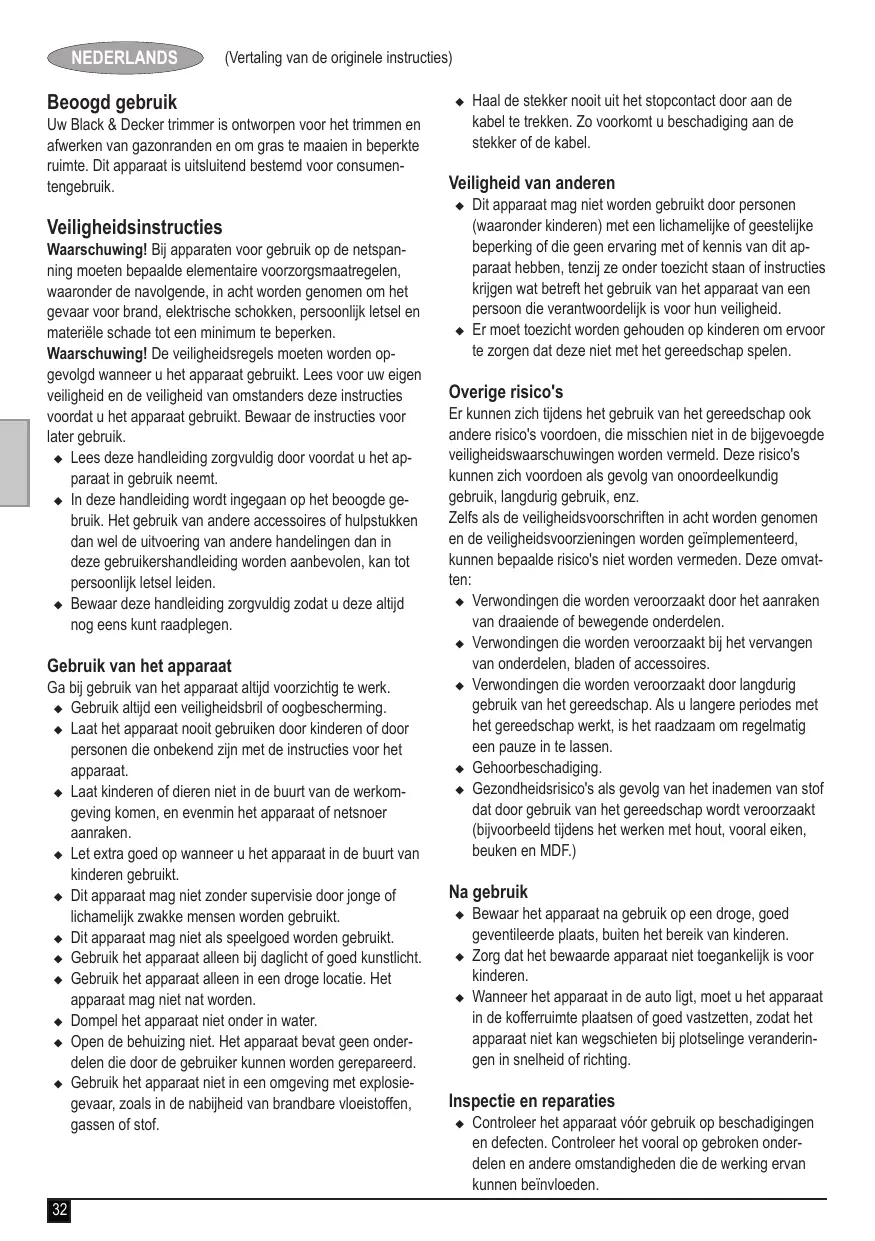 NEDERLANDS (Vertaling van de originele instructies) Beoogd gebruik Uw Black & Decker trimmer is ontworpen voor het trimmen en afwerken van gazonranden en om gras te maaien in beperkte ruimte. Dit apparaat is uitsluitend bestemd voor consumentengebruik. Veiligheidsinstructies Waarschuwing! Bij apparaten voor gebruik op de netspanning moeten bepaalde elementaire voorzorgsmaatregelen, waaronder de navolgende, in acht worden genomen om het gevaar voor brand, elektrische schokken, persoonlijk letsel en materiële schade tot een minimum te beperken. Waarschuwing! De veiligheidsregels moeten worden opgevolgd wanneer u het apparaat gebruikt. Lees voor uw eigen veiligheid en de veiligheid van omstanders deze instructies voordat u het apparaat gebruikt. Bewaar de instructies voor later gebruik. u Lees deze handleiding zorgvuldig door voordat u het apparaat in gebruik neemt. u In deze handleiding wordt ingegaan op het beoogde gebruik. Het gebruik van andere accessoires of hulpstukken dan wel de uitvoering van andere handelingen dan in deze gebruikershandleiding worden aanbevolen, kan tot persoonlijk letsel leiden. u Bewaar deze handleiding zorgvuldig zodat u deze altijd nog eens kunt raadplegen. Gebruik van het apparaat Ga bij gebruik van het apparaat altijd voorzichtig te werk. u Gebruik altijd een veiligheidsbril of oogbescherming. u Laat het apparaat nooit gebruiken door kinderen of door personen die onbekend zijn met de instructies voor het apparaat. u Laat kinderen of dieren niet in de buurt van de werkomgeving komen, en evenmin het apparaat of netsnoer aanraken. u Let extra goed op wanneer u het apparaat in de buurt van kinderen gebruikt. u Dit apparaat mag niet zonder supervisie door jonge of lichamelijk zwakke mensen worden gebruikt. u Dit apparaat mag niet als speelgoed worden gebruikt. u Gebruik het apparaat alleen bij daglicht of goed kunstlicht. u Gebruik het apparaat alleen in een droge locatie. Het apparaat mag niet nat worden. u Dompel het apparaat niet onder in water. u Open de behuizing niet. Het apparaat bevat geen onderdelen die door de gebruiker kunnen worden gerepareerd. u Gebruik het apparaat niet in een omgeving met explosiegevaar, zoals in de nabijheid van brandbare vloeistoffen, gassen of stof.