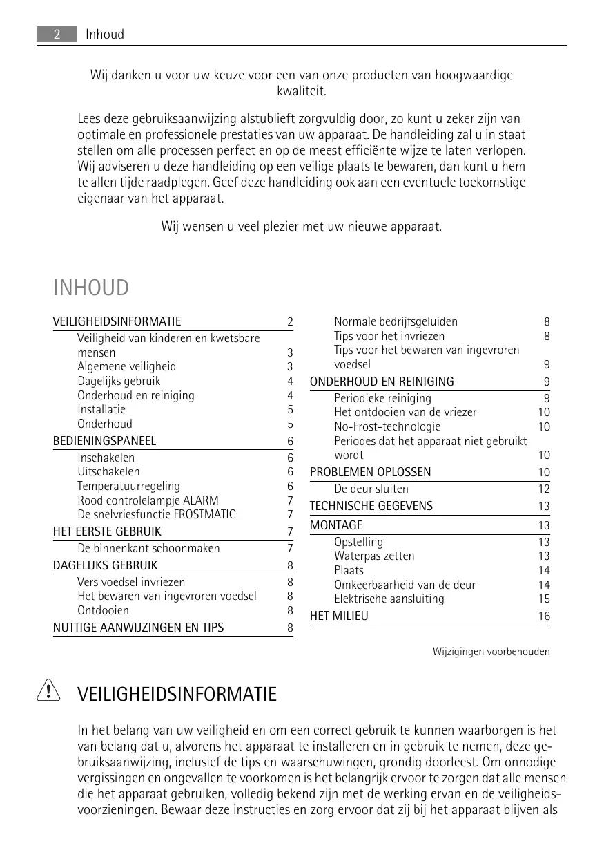 Wijzigingen voorbehouden L\ VEILIGHEIDSINFORMATIE In het belang van uw veiligheid en om een correct gebruik te kunnen waarborgen is het van belang dat u, alvorens het apparaat te installeren en in gebruik te nemen, deze ge- bruiksaanwijzing, inclusief de tips en waarschuwingen, grondig doorleest. Om onnodige vergissingen en ongevallen te voorkomen is het belangrijk ervoor te zorgen dat alle mensen die het apparaat gebruiken, volledig bekend zijn met de werking ervan en de veiligheids- voorzieningen. Bewaar deze instructies en zorg ervoor dat zij bij het apparaat blijven als