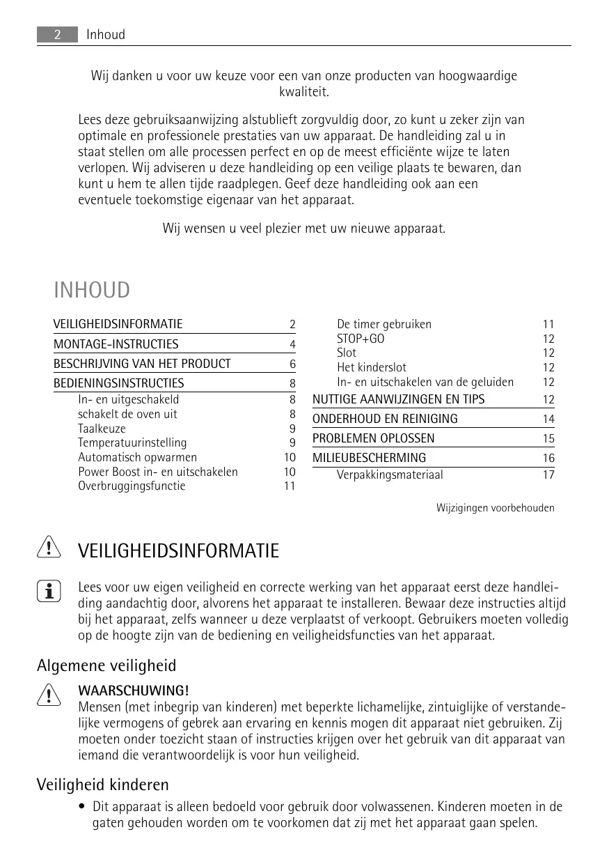 Wijzigingen voorbehouden VEILIGHEIDSINFORMATIE Lees voor uw eigen veiligheid en correcte werking van het apparaat eerst deze handleiding aandachtig door, alvorens het apparaat te installeren. Bewaar deze instructies altijd bij het apparaat, zelfs wanneer u deze verplaatst of verkoopt. Gebruikers moeten volledig op de hoogte zijn van de bediening en veiligheidsfuncties van het apparaat. Algemene veiligheid WAARSCHUWING! Mensen (met inbegrip van kinderen) met beperkte lichamelijke, zintuiglijke of verstandelijke vermogens of gebrek aan ervaring en kennis mogen dit apparaat niet gebruiken. Zij moeten onder toezicht staan of instructies krijgen over het gebruik van dit apparaat van iemand die verantwoordelijk is voor hun veiligheid. Veiligheid kinderen