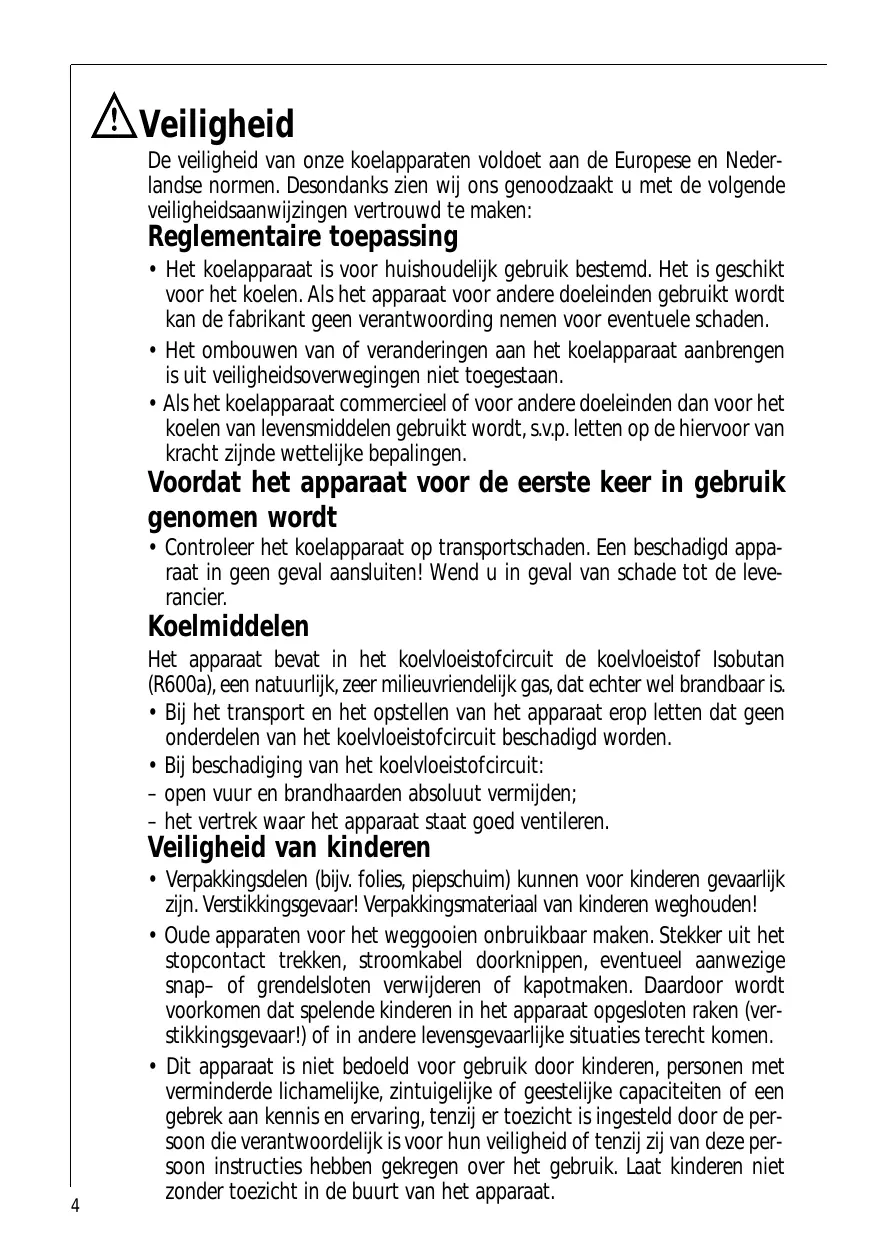 Veiligheid De veiligheid van onze koelapparaten voldoet aan de Europese en Nederlandse normen. Desondanks zien wij ons genoodzaakt u met de volgende veiligheidsaanwijzingen vertrouwd te maken: Reglementaire toepassing