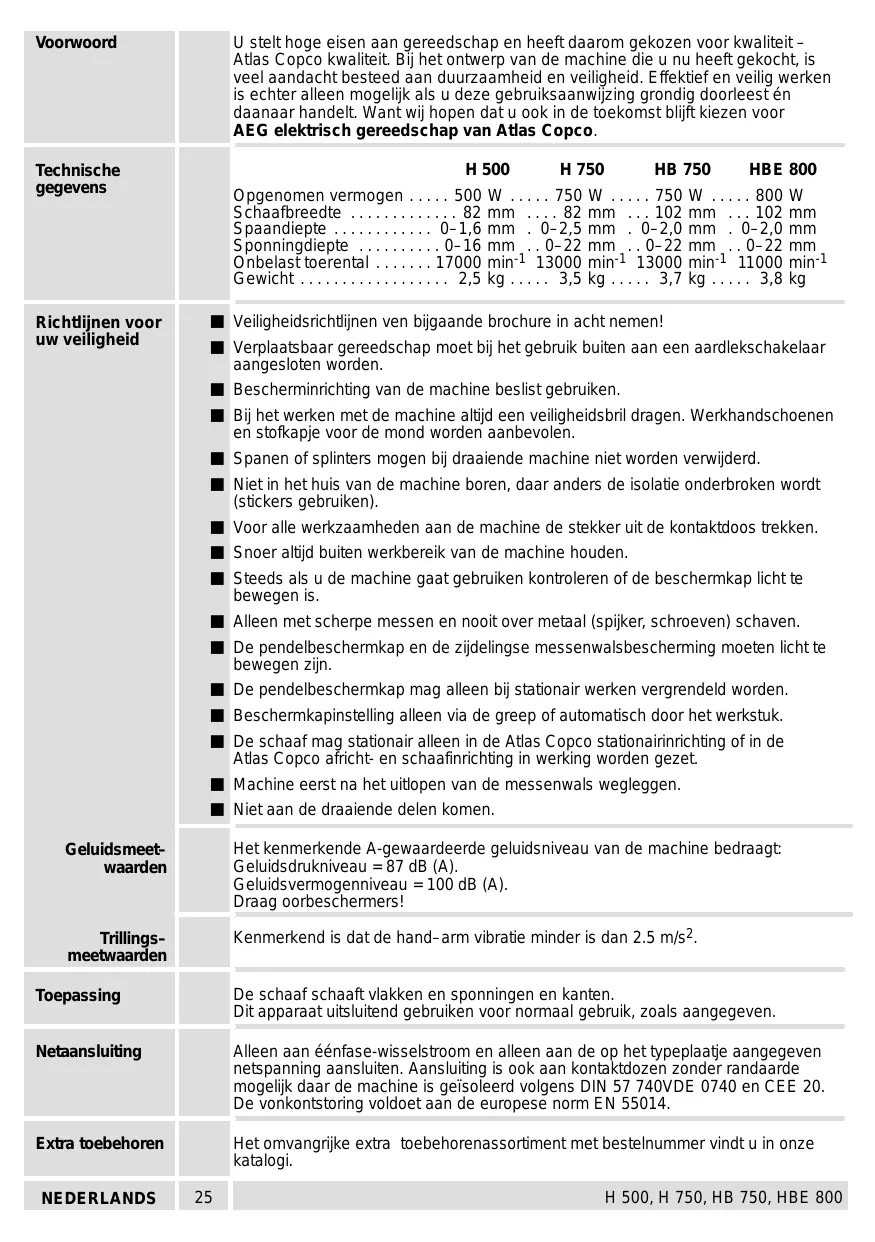 - : 3,7kg ,8 kg Onbelasttoerental Gewicht nee Veiligheidsrichtinen ven bijgaande brochure in achtnemen! Verplaatsbaar gereedschap moet bij het gebruik buiten aan een aardiekschakelaar aangesloten worden. Bescherminrichting van de machine beslist gebruiken: Bi het werken met de machine altjd een veiligheidsbril dragen. Werkhandschoenen en stofkapje voor de mond worden aanbevolen. Spanen of splinters mogen bij draaiende machine niet worden verwijderd Niet in het huis van de machine boren, daar anders de isolatie onderbroken wordt (stickers gebruiken) Voor alle werkzaamheden aan de machine de stekker uit de kontaktdoos trekken. Snoer altid buiten werkbereik van de machine houden. Steeds als u de machine gaat gebruiken kontroleren of de beschermkap licht te bewegen is Alleen met scherpe messen en nooît over metaal (spiker, schroeven) schaven. De pendelbeschermkap en de zidelingse messenwalsbescherming moeten licht te bewegen zin. De pendelbeschermkap mag alleen bij stationair werken vergrendeld worden Beschermkapinstelling alleen via de greep of automatisch door het werkstuk. De schaaf mag stationair leen h de Atas Copco stonalrnriching ofin de Atlas Copco africht- en schaafinrichäng in werking worden gezet. Machine eerst na het uitiopen van de messenwals wegleggen. Niet aan de draaiende delen komen. Het kenmerkende A-gewaardeerde geluidsniveau van de machine bedraagt Geluidsdrukniveau = 87 dB (A). Geluidsvermogenniveau = 100 dB (A). Draag oorbeschermers! Kenmerkend is dat de hand-arm vibratie minder is dan 2.5 m/s2 De schaaf schaaft viakken en sponningen en kanten Dit apparaat uitsluitend gebruiken voor normal gebruik, zoals aangegeven. Alleen aan éénfase-wisselstroom en alleen aan de op het typeplaatie aangegeven netspanning aansluiten. Aansluïting is ook aan kontaktdozen zonder randaarde mogelijk daar de machine is geïsoleerd volgens DIN 57 740VDE 0740 en CEE 20. De vonkontstoring voldoet aan de europese norm EN 55014. Het omvangrike extra toebehorenassortiment met bestelnummer vindt u in onze Katalogi. p. 3