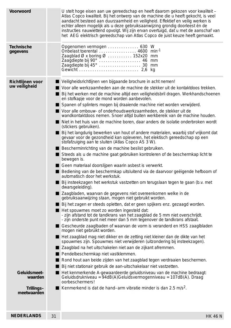 Veiligheidsrichtlijnen ven bijgaande brochure in acht nemen! Voor alle werkzaamheden aan de machine de stekker uit de kontaktdoos trekken. Bij het werken met de machine altijd een veiligheidsbril dragen. Werkhandschoenen en stofkapje voor de mond worden aanbevolen. Spanen of splinters mogen bij draaiende machine niet worden verwijderd. Voor alle ombouw- of onderhoudswerkzaamheden, de stekker uit de wandkontaktdoos nemen. Snoer altijd buiten werkbereik van de machine houden. Niet in het huis van de machine boren, daar anders de isolatie onderbroken wordt (stickers gebruiken). Bij het langdurig bewerken van hout of andere materialen, waarbij stof vrijkomt dat gevaar voor de gezondheid kan opleveren, het elektisch gereedschap op een stofafzuiging aan te sluiten (Atlas Copco AS 3 W). Bescherminrichting van de machine beslist gebruiken. Steeds als u de machine gaat gebruiken kontroleren of de beschermkap licht te bewegen is. Geen materiaal doorslijpen waarin asbest is verwerkt. Bediening van de beschermkap uitsluitend via de daarvoor geëigende hefboom of automatisch door het werkstuk. Bij insteekzagen het werkstuk vastzetten om terugslaan tegen te gaan (b.v. met dwarsgeleiding). Zaagbladen, waarvan de gegevens niet overeenkomen welke in de gebruiksaanwijzing staan, mogen niet gebruikt worden. Bij het zagen er steeds opletten, dat er geen spijkers enz. gezaagd worden. Het spouwmes moet zo worden ingesteld dat: - zijn afstand tot de tandkrans van het zaagblad de 5 mm niet overschrijdt. - zijn onderste punt niet meer dan 5 mm tegenover de tandkrans afstaat. Gescheurde zaaglbaden of waarvan de vorm is veranderd en HSS zaaglbladen mogen niet gebruikt worden. Het zaagblad mag niet dikker en de zetting niet kleiner dan de dikte van het spouwmes zijn. Spouwmes niet verwijderen (uitzondering bij insteekzagen). Zaagblad na het uitschakelen niet aan de zijkant afremmen. Pendelbeschermkap niet vastklemmen. Rond hout aan beide zijden van het zaagblad tegen verdraaien beschermen. Bij niet stationair gebruik de aan-uitschakelaar niet vastzetten. Het kenmerkende A-gewaardeerde geluidsniveau van de machine bedraagt: Geluidsdrukniveau = 94dB(A)Geluidsvermogenniveau = 107dB(A). Draag oorbeschermers! Kenmerkend is dat de hand–arm vibratie minder is dan 2.5 m/s2.