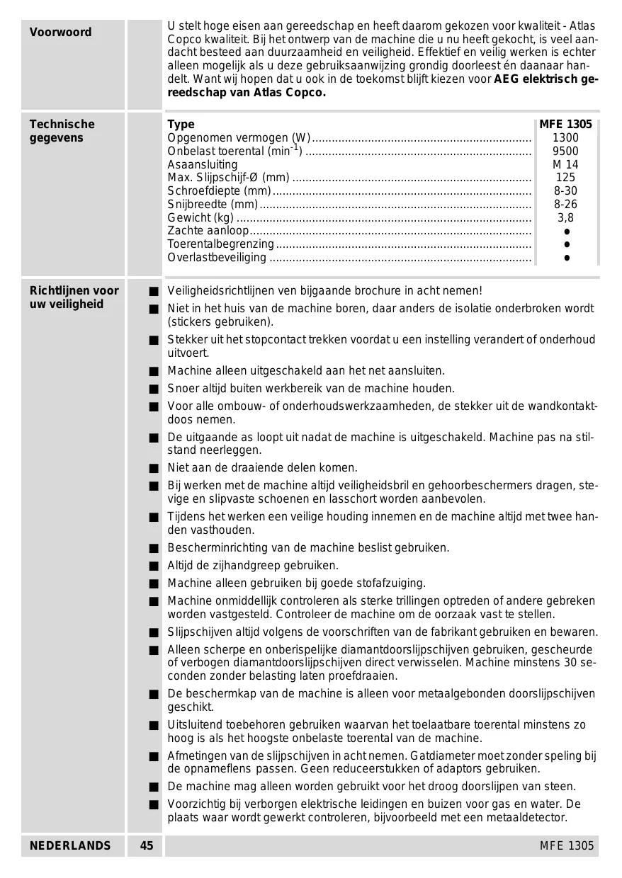 MFE 1305 U stelt hoge eisen aan gereedschap en heeft daarom gekozen voor kwaliteit - Atlas Copco kwaliteit. Bij het ontwerp van de machine die u nu heeft gekocht, is veel aandacht besteed aan duurzaamheid en veiligheid. Effektief en veilig werken is echter alleen mogelijk als u deze gebruiksaanwijzing grondig doorleest én daanaar handelt. Want wij hopen dat u ook in de toekomst blijft kiezen voor AEG elektrisch gereedschap van Atlas Copco. Voorwoord Technische gegevens Type MFE 1305 Opgenomen vermogen (W) ................................................................... Onbelast toerental (min-1) ..................................................................... Asaansluiting M 14 Max. Slijpschijf-Ø (mm) ......................................................................... Schroefdiepte (mm) ............................................................................... 8-30 Snijbreedte (mm) ................................................................................... 8-26 Gewicht (kg) .......................................................................................... 3,8 Zachte aanloop...................................................................................... Toerentalbegrenzing .............................................................................. Overlastbeveiliging ................................................................................