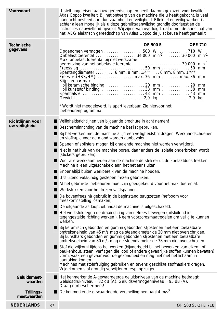 - Voorwoord U stelt hoge eisen aan uw gereedschap en heeft daarom gekozen voor kwaliteit – Atlas Copco kwaliteit. Bij het ontwerp van de machine die u heeft gekocht, is veel aandacht besteed aan duurzaamheid en veiligheid. Effektief en veilig werken is echter alleen mogelijk als u deze gebruiksaanwijzing grondig doorleest én de instructies nauwiettend opvolgt. Wij zijn ervan overtuigd, dat u met de aanschaf van het AEG elektrisch gereedschap van Atlas Copco de juist keuze heeft gemaakt. Technische gegevens OF 500 S OFE 710 Opgenomen vermogen p. 500