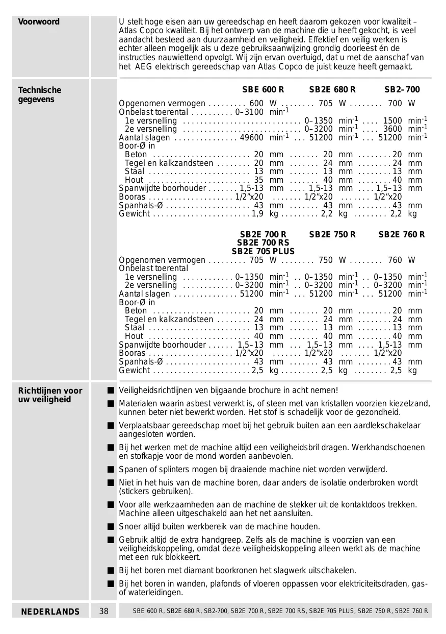 U stelt hoge eisen aan uw gereedschap en heeft daarom gekozen voor kwaliteit - Atias Copco kwaliteït. Bij het ontwerp van de machine die u heeft gekocht, is veel aandacht besteed aan duurzaamheid en velligheid. Effektief en vellg werken is echter alleen mogelik als u deze gebruiksaanwijzing grondig doorleest én de instucties nauwietend opvolgt. Wi zin ervan overtuig, dat u met de aanschaf van het AEG elektisch gereedschap van Atlas Copco de juist keuze heeft gemaakt SBE 600 R SB2E 680R SB2-700 Opgenomen vermogen .… 600 W 705 W 700 W Onbelasttoerental .… : ‘3100 mind Le versnelling . min: min: 2e versnelling mini mini Aantal slagen mini mini Boor- in Beton ................. mm . mm Tegel en kalkzandsteen mm :.. mm . mm : mm Aout mm : mm Spanwidte boorhoud\ 3 mm .:..15-13 mm BOOas ..…...... -'1/2"x20 Spanhais-0 .: mm : .43 mm Gewicht kg kg SB2E700R SB2E750R SB2E 760R SB2E 700 RS