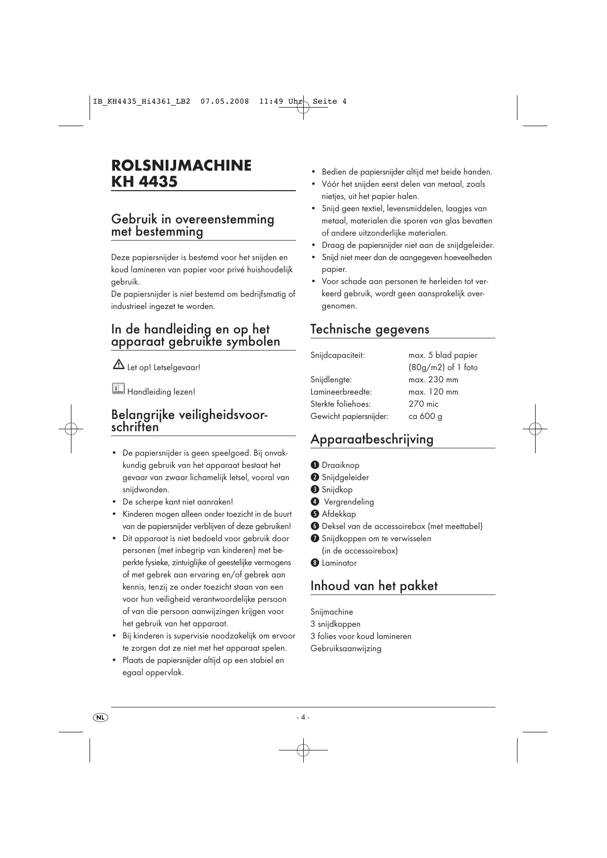 +_ De papiersnider is geen speelgoed. Bij onvak- kundig gebruik van het apparaat bestaat het gevaar van zwaar lichamelifk letsel, vooral van snijdwonden.