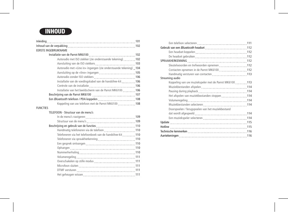 Hnsding Hnhoud un de varpaling EERSTE INGEBRUIKNAME FuncnEs Install van de Parrot 6100, . Autordie met steker [ie onderstaande clening) Bansuting van de 15 stekers . Autoradio mt line ins ingangen (onde Aanauing op de aline ingangen Autoradio zone 15 stekers Instalatie van de voedingakaba van de hand Controle an de instalatie eu Install van ht becscherm van de Parrot MCE 100 Besching van de Parrot MK6100 Een Bluetooth teefoon / PDA Hoppelen. Koppeling van us telloon met de Parrot 8100. Re] TELEFOON - Siueuur van de menus In de menu navigeren Struur van de menus Besching en gebruik van de functes Handmatig tlefoneren via de teioon Télfoneren vi et tlefoonboek van de hand Kit Télfanern via spraakherhenning Een gesprek onrangen Ophangen…. Rurmehethaing Volumeregeing : Overschakelen op ile modes Micrfon ste DM verse. Het geheugen visser Een telefoon selecteren “Gebrk an een Bluetooth het Een head oppelen De eadset gebruken SPRARCHERKENNING. LT Slutehioordn en reicorden opnemen Conactn opnemen in de Parrot MKE100 Handmatig ersturen van ontacten Streaming audio Koppeing van uu muzekspaler met de Par MK6100 ucehbestanden afspalen Paushg during paÿback : Het ahapelen van muekbestanden stopper Volumeregeling : Murehbestanden scan Doorsplen /Terugspocen van het mu bestand at ardt afgespeod Een mugekspelerseleciren Hotine Teische enmerken Bantekeningen