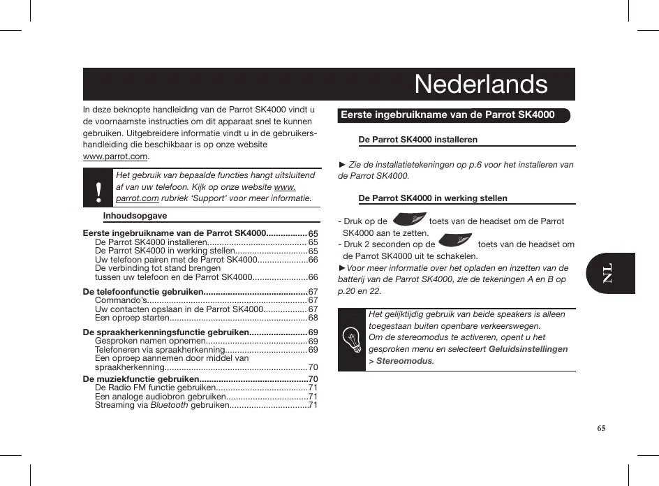 Inhoudsopgave Eerste ingebruikname van de Parrot SK4000. De Parrot SK4000 installeren. 65 De Parrot SK4000 in werking Stellen 65 Uw telefoon pairen met de Parrot SK4000. 66 De verbinding tot stand brengen tussen uw telefoon en de Parrot SK4000. 66