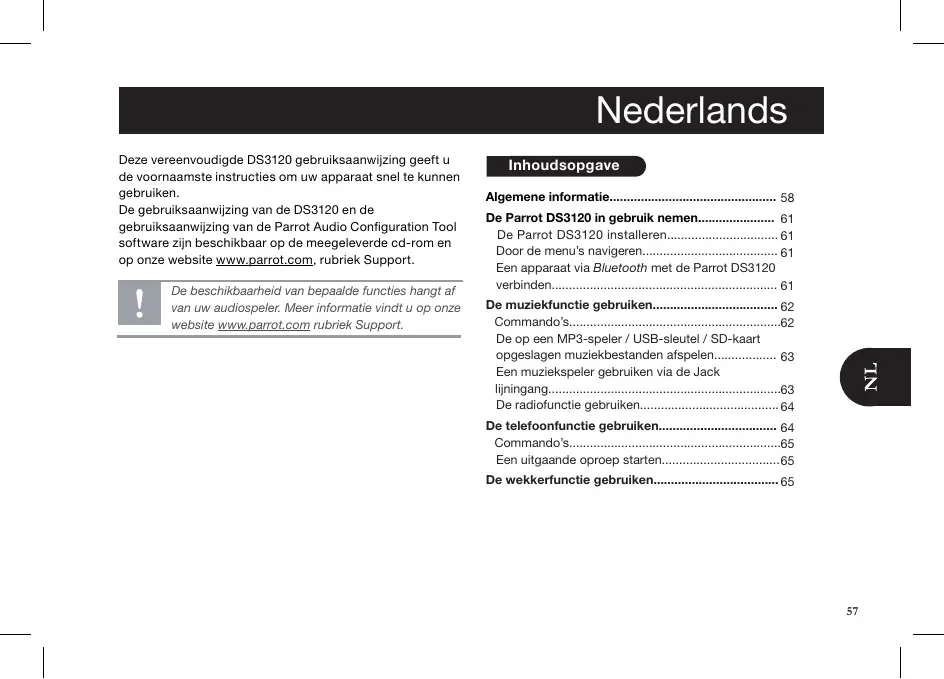 Nederlands Deze vereenvoudigde DS3120 gebruiksaanwijzing geeft u de voornaamste instructies om uw apparaat snel te kunnen gebruiken. De gebruiksaanwijzing van de DS8120 en de gebruiksaanwizing van de Parrot Audio Configuration Tool Software zijn beschikbaar op de meegeleverde cd-rom en op onze website wwparrot.com, rubriek Support. ties hi De beschikbaarheld van bepaalde fui af van uw audiospeler. Meer website www parrot. cor formatie vindt u op onze ubriek Support Inhoudsopgave Algemene informati De Parrot DS3120 in gebruik nemen. De Parrot DS3120 installeren. Door de menu's navigeren: 61 Een apparaat via Bluetooth met de Parrot DS3120 verbinden. 6] De muziekfunctie gebruiken. Commando's. De op een MP3-speler / USB-sieutel / SD-kaart opgeslagen muziekbestanden afspelen. 6 Een muziekspeler gebruiken via de Jack liningang. 63 De radiofunctie gebruiken. 64 De telefoonfunctie gebruiken. Commando's. Een uitgaande oproep starten. De wekkerfunctie gebruiken.