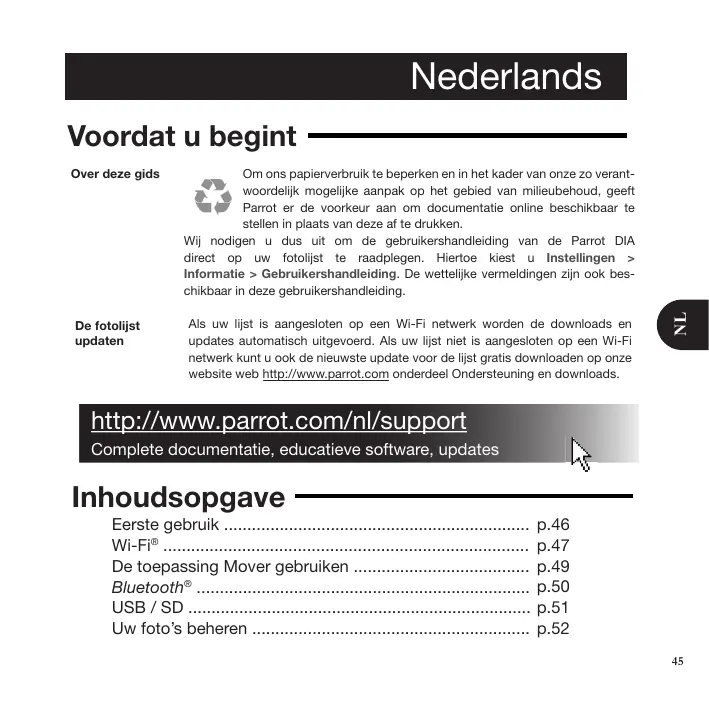 Sm@ l'environnement, Parrot privilégie la mise en ligne des documents utlisateurs plutôt que leur impression. Nous vous invitons donc à consuter le guide utilisateur du Parrot DIA directement sur votre cadre photo. Pour cela, sélectionnez Réglages > Informations > Guide utilisateur. Les men-