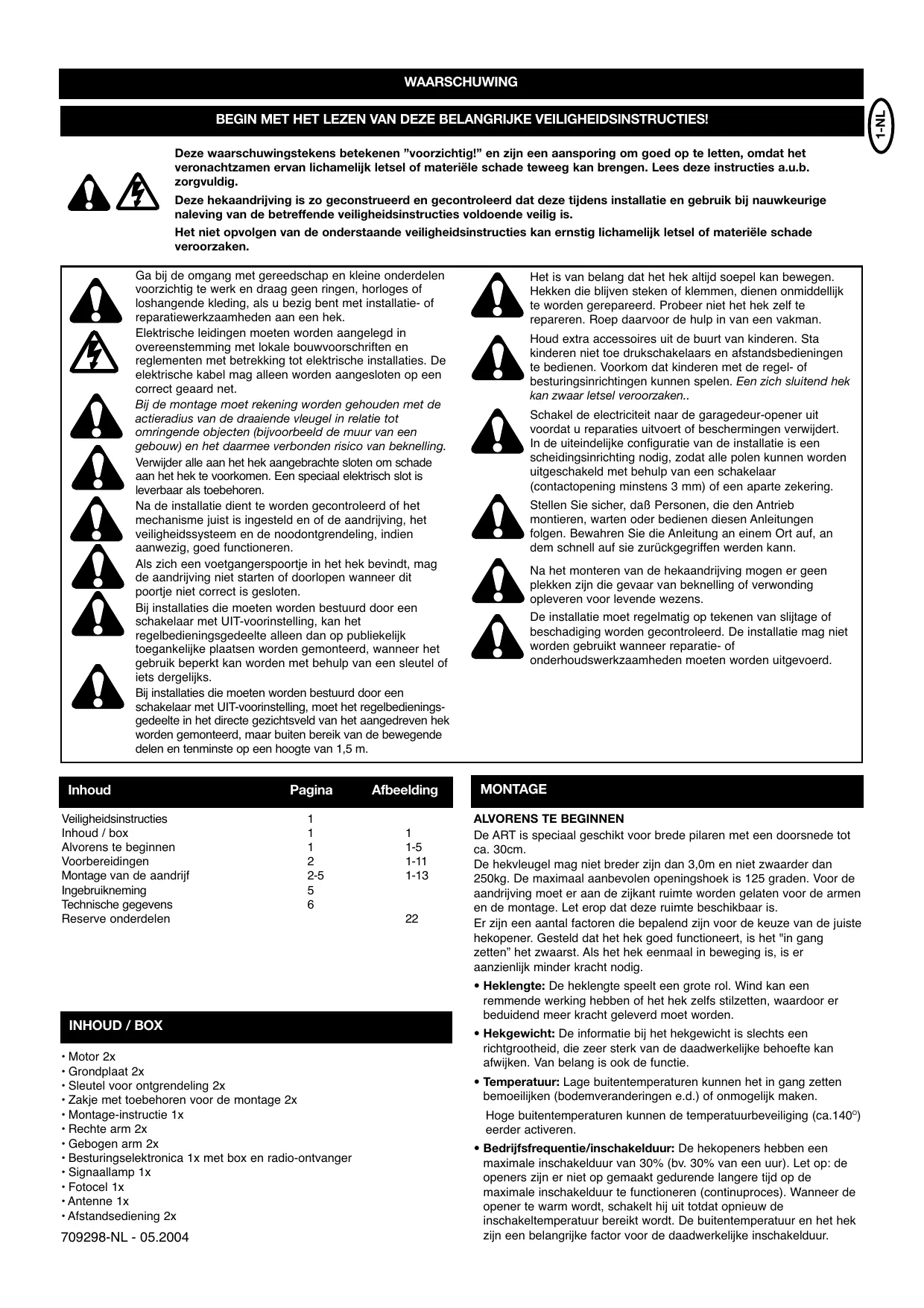 1-F AVERTISSEMENT Contrôler le contenu de l'emballage et lire attentivement les présentes instructions. S'assurer du parfait fonctionnement de votre système de portail. Le portail doit pivoter de manière régulière, sans à-coups, et ne coincer nulle part. Tenir compte du fait que le sol peut être rehaussé de quelques centimètres en hiver. Afin d'éviter tout mouvement pendulaire gênant, le portail doit être stable et présenter un jeu aussi faible que possible. Plus le battant pivote en douceur, et plus la force devra être réglée avec précision.