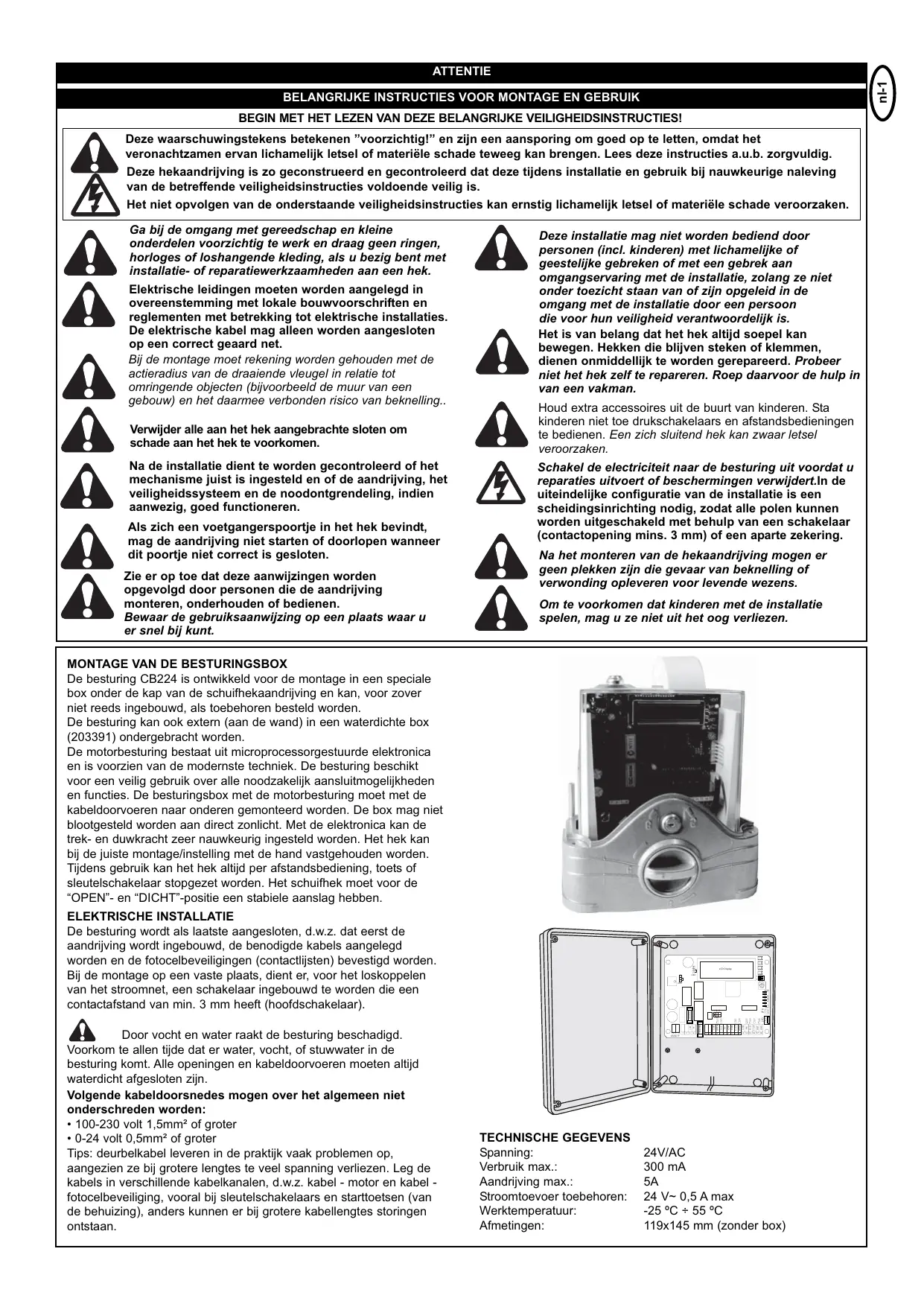 MONTAGE VAN DE BESTURINGSBOX De besturing CB224 is ontwikkeld voor de montage in een speciale box onder de kap van de schuifhekaandrijving en kan, voor zover niet reeds ingebouwd, als toebehoren besteld worden. De besturing kan ook extern (aan de wand) in een waterdichte box (203391) ondergebracht worden. De motorbesturing bestaat uit microprocessorgestuurde elektronica en is voorzien van de modernste techniek. De besturing beschikt voor een veilig gebruik over alle noodzakelijk aansluitmogelijkheden en functies. De besturingsbox met de motorbesturing moet met de kabeldoorvoeren naar onderen gemonteerd worden. De box mag niet blootgesteld worden aan direct zonlicht. Met de elektronica kan de trek- en duwkracht zeer nauwkeurig ingesteld worden. Het hek kan bij de juiste montage/instelling met de hand vastgehouden worden. Tijdens gebruik kan het hek altijd per afstandsbediening, toets of sleutelschakelaar stopgezet worden. Het schuifhek moet voor de “OPEN”- en “DICHT”-positie een stabiele aanslag hebben.