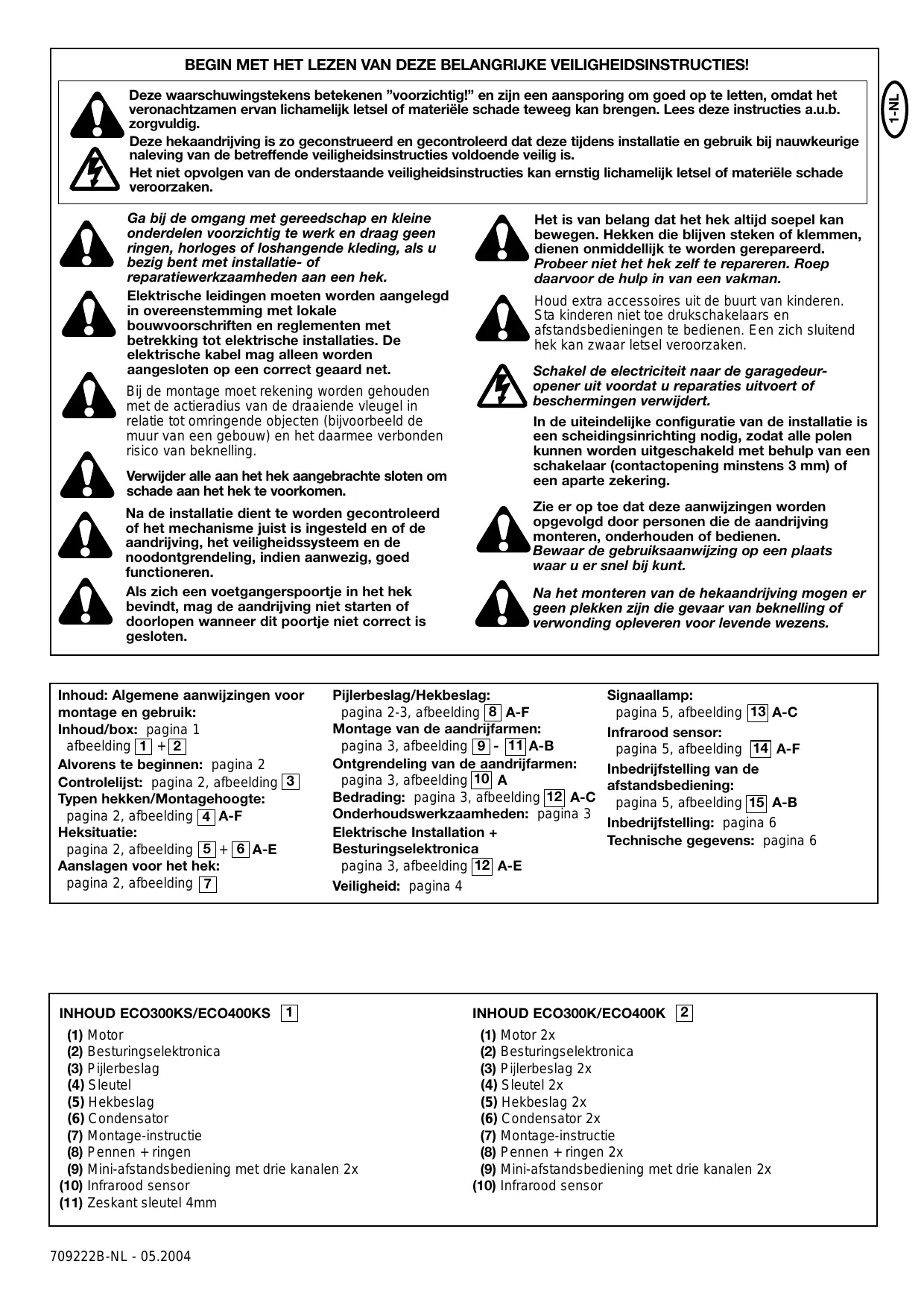 INHOUD ECO300KS/ECO400KS Houd extra accessoires uit de buurt van kinderen. Sta kinderen niet toe drukschakelaars en afstandsbedieningen te bedienen. Een zich sluitend hek kan zwaar letsel veroorzaken. Schakel de electriciteit naar de garagedeuropener uit voordat u reparaties uitvoert of beschermingen verwijdert. In de uiteindelijke configuratie van de installatie is een scheidingsinrichting nodig, zodat alle polen kunnen worden uitgeschakeld met behulp van een schakelaar (contactopening minstens 3 mm) of een aparte zekering. Zie er op toe dat deze aanwijzingen worden opgevolgd door personen die de aandrijving monteren, onderhouden of bedienen. Bewaar de gebruiksaanwijzing op een plaats waar u er snel bij kunt. Na het monteren van de hekaandrijving mogen er geen plekken zijn die gevaar van beknelling of verwonding opleveren voor levende wezens.
