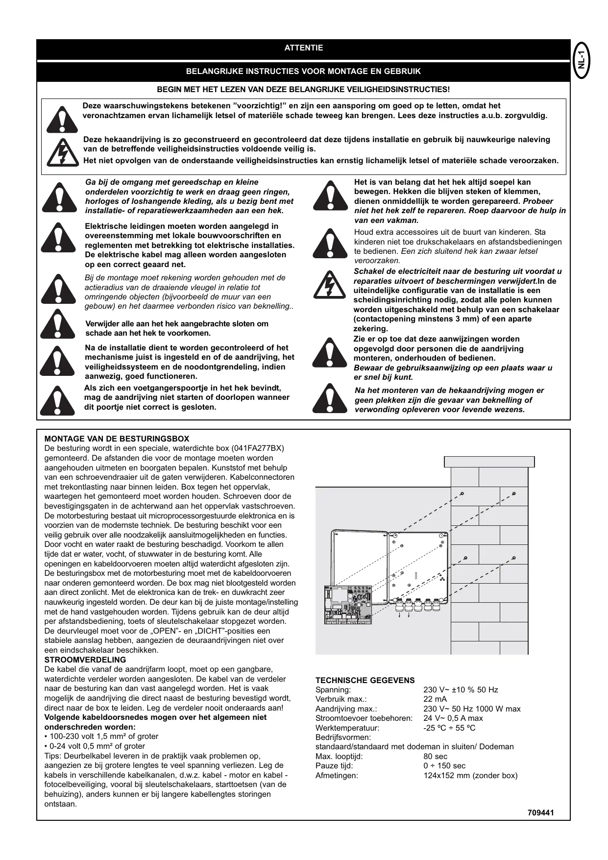 BEGIN MET HET LEZEN VAN DEZE BELANGRIJKE VEILIGHEIDSINSTRUCTIES! Deze waarschuwingstekens betekenen ”voorzichtig!” en zijn een aansporing om goed op te letten, omdat het veronachtzamen ervan lichamelijk letsel of materiële schade teweeg kan brengen. Lees deze instructies a.u.b. zorgvuldig. Deze hekaandrijving is zo geconstrueerd en gecontroleerd dat deze tijdens installatie en gebruik bij nauwkeurige naleving van de betreffende veiligheidsinstructies voldoende veilig is. Het niet opvolgen van de onderstaande veiligheidsinstructies kan ernstig lichamelijk letsel of materiële schade veroorzaken. Ga bij de omgang met gereedschap en kleine onderdelen voorzichtig te werk en draag geen ringen, horloges of loshangende kleding, als u bezig bent met installatie- of reparatiewerkzaamheden aan een hek. Elektrische leidingen moeten worden aangelegd in overeenstemming met lokale bouwvoorschriften en reglementen met betrekking tot elektrische installaties. De elektrische kabel mag alleen worden aangesloten op een correct geaard net. Bij de montage moet rekening worden gehouden met de actieradius van de draaiende vleugel in relatie tot omringende objecten (bijvoorbeeld de muur van een gebouw) en het daarmee verbonden risico van beknelling.. Verwijder alle aan het hek aangebrachte sloten om schade aan het hek te voorkomen. Na de installatie dient te worden gecontroleerd of het mechanisme juist is ingesteld en of de aandrijving, het veiligheidssysteem en de noodontgrendeling, indien aanwezig, goed functioneren. Als zich een voetgangerspoortje in het hek bevindt, mag de aandrijving niet starten of doorlopen wanneer dit poortje niet correct is gesloten.