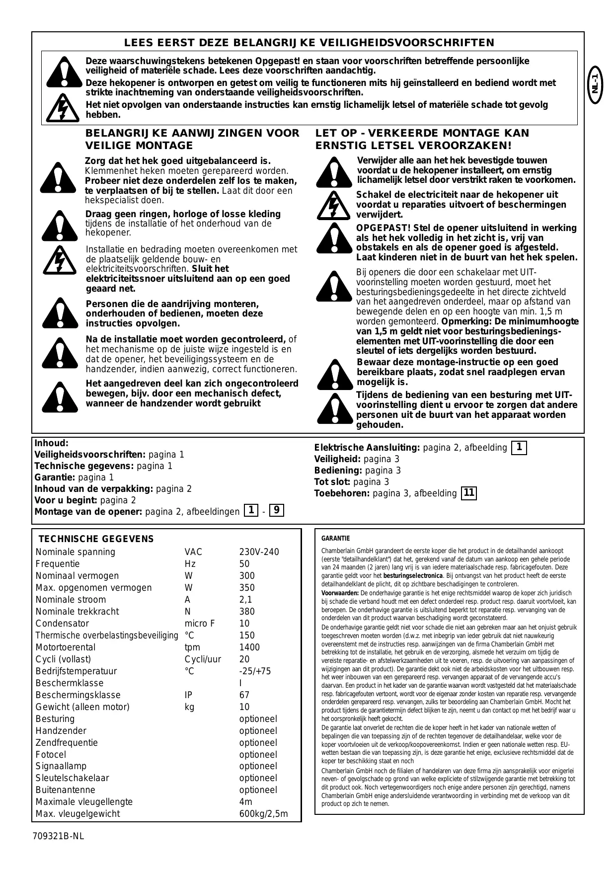 Consigne de Sécurité: Page 1 Caractéristiques techniques: Page 1 Garantie: Page 1 Contenu du coli: Page 2 Avant de commencer: Page 2 Montage de l’Automatisme: Page 2, Figures 1 - 9 CARACTERISTIQUES TECHNIQUES Tension nominale VAC Fréquence Cette garantie ne couvre pas les dommages qui ne sont pas causés par un appareil défectueux et qui résultent d'une utilisation abusive (y compris une utilisation qui n'est pas exactement conforme aux consignes d'installation, de fonctionnement et d'entretien préconisées par Chamberlain GmbH, un manque d'entretien et de réglage nécessaires, toute adaptation ou modification des appareils, tous frais associés au démontage ou à la réinstallation d'une pièce réparée ou changée et au remplacement des piles. Un produit sous garantie dont le défaut de fabrication et/ou de matériel est reconnu sera réparé ou remplacé (au choix de Chamberlain GmbH) sans frais pour le propriétaire en ce qui conceme la réparation ou le remplacement de la pièce défectueuse ou du produit. Les pièces défectueuses seront réparées ou remplacées par des pièces neuves ou réusinées, au choix de Chamberlain GmbH. Cette garantie n'affecte pas les droits statutaires de l'acheteur sous la législation nationale applicable en vigueur. Cette garantie n'affecte pas non plus les droits de l'acheteur à l'égard du revendeur conformément aux termes du contrat de vente/achat. En l'absence de législation nationale ou CE applicable, cette garantie constituera le seul recours exclusif de I'acheteur et, dans le cadre de toute garantie expresse ou implicite concernant ce produit, ni Chamberlain ni ses associés ou distributeurs ne seront responsables de tous dommages accidentels ou relationnels. Aucune personne n'est mandatée ni autorisée par Chamberlain GmbH à assumer quelqu'autre responsabilité en liaison avec la vente de ce produit.