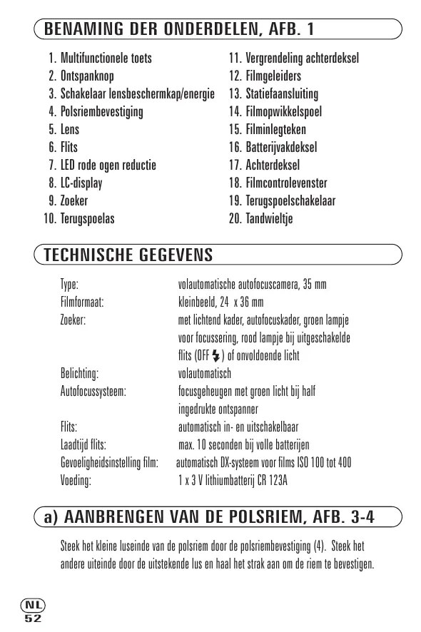 - Als u een neue film inlegt en de opnameteller op nul staat, is de film möglichk fouitief ingelegd. Open het achterdeksel en leg de film opnieuw in.