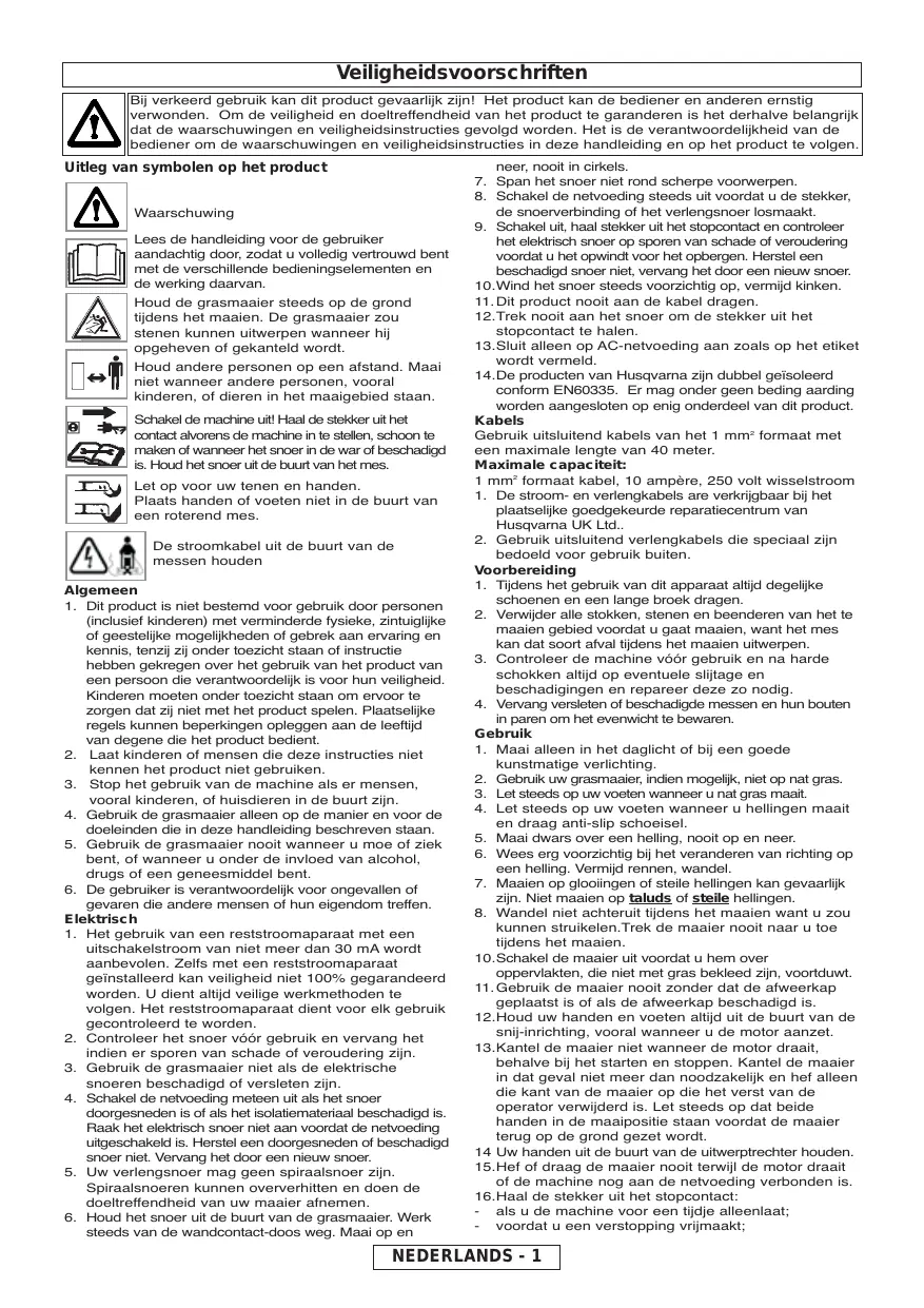 geplaatst is of als de afweerkap beschadigd is. 12.Houd uw handen en voeten altijd uit de buurt van de snij-inrichting, vooral wanneer u de motor aanzet. 13.Kantel de maaier niet wanneer de motor draait, behalve bij het starten en stoppen. Kantel de maaier in dat geval niet meer dan noodzakelijk en hef alleen die kant van de maaier op die het verst van de operator verwijderd is. Let steeds op dat beide handen in de maaipositie staan voordat de maaier terug op de grond gezet wordt. 14 Uw handen uit de buurt van de uitwerptrechter houden. 15.Hef of draag de maaier nooit terwijl de motor draait of de machine nog aan de netvoeding verbonden is. 16.Haal de stekker uit het stopcontact: - als u de machine voor een tijdje alleenlaat; - voordat u een verstopping vrijmaakt; NEDERLANDS - 1 Veiligheidsvoorschriften