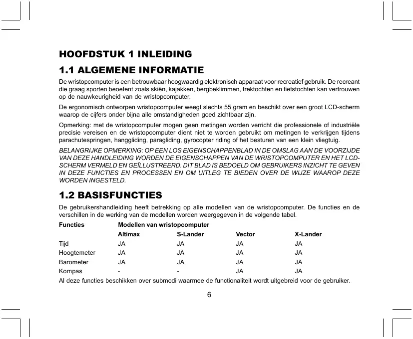 De wristopcomputer is een betrouwbaar hoogwaardig elektronisch apparaat voor recreatief gebruik. De recreant die graag sporten beoefent zoals skiën, kajakken, bergbeklimmen, trektochten en fietstochten kan vertrouwen op de nauwkeurigheid van de wristopcomputer. De ergonomisch ontworpen wristopcomputer weegt slechts 55 gram en beschikt over een groot LCD-scherm waarop de cijfers onder bijna alle omstandigheden goed zichtbaar zijn. Opmerking: met de wristopcomputer mogen geen metingen worden verricht die professionele of industriële precisie vereisen en de wristopcomputer dient niet te worden gebruikt om metingen te verkrijgen tijdens parachutespringen, hanggliding, paragliding, gyrocopter riding of het besturen van een klein vliegtuig. BELANGRIJKE OPMERKING: OP EEN LOS EIGENSCHAPPENBLAD IN DE OMSLAG AAN DE VOORZIJDE VAN DEZE HANDLEIDING WORDEN DE EIGENSCHAPPEN VAN DE WRISTOPCOMPUTER EN HET LCDSCHERM VERMELD EN GEÏLLUSTREERD. DIT BLAD IS BEDOELD OM GEBRUIKERS INZICHT TE GEVEN IN DEZE FUNCTIES EN PROCESSEN EN OM UITLEG TE BIEDEN OVER DE WIJZE WAAROP DEZE WORDEN INGESTELD.