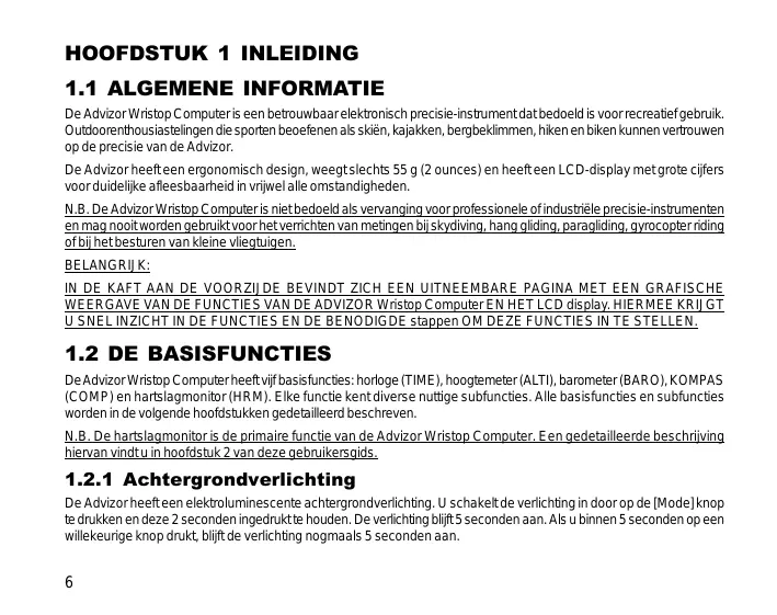 De Advizor Wristop Computer is een betrouwbaar elektronisch precisie-instrument dat bedoeld is voor recreatief gebruik. Outdoorenthousiastelingen die sporten beoefenen als skiën, kajakken, bergbeklimmen, hiken en biken kunnen vertrouwen op de precisie van de Advizor. De Advizor heeft een ergonomisch design, weegt slechts 55 g (2 ounces) en heeft een LCD-display met grote cijfers voor duidelijke afleesbaarheid in vrijwel alle omstandigheden. N.B. De Advizor Wristop Computer is niet bedoeld als vervanging voor professionele of industriële precisie-instrumenten en mag nooit worden gebruikt voor het verrichten van metingen bij skydiving, hang gliding, paragliding, gyrocopter riding of bij het besturen van kleine vliegtuigen. BELANGRIJK: IN DE KAFT AAN DE VOORZIJDE BEVINDT ZICH EEN UITNEEMBARE PAGINA MET EEN GRAFISCHE WEERGAVE VAN DE FUNCTIES VAN DE ADVIZOR Wristop Computer EN HET LCD display. HIERMEE KRIJGT U SNEL INZICHT IN DE FUNCTIES EN DE BENODIGDE stappen OM DEZE FUNCTIES IN TE STELLEN.