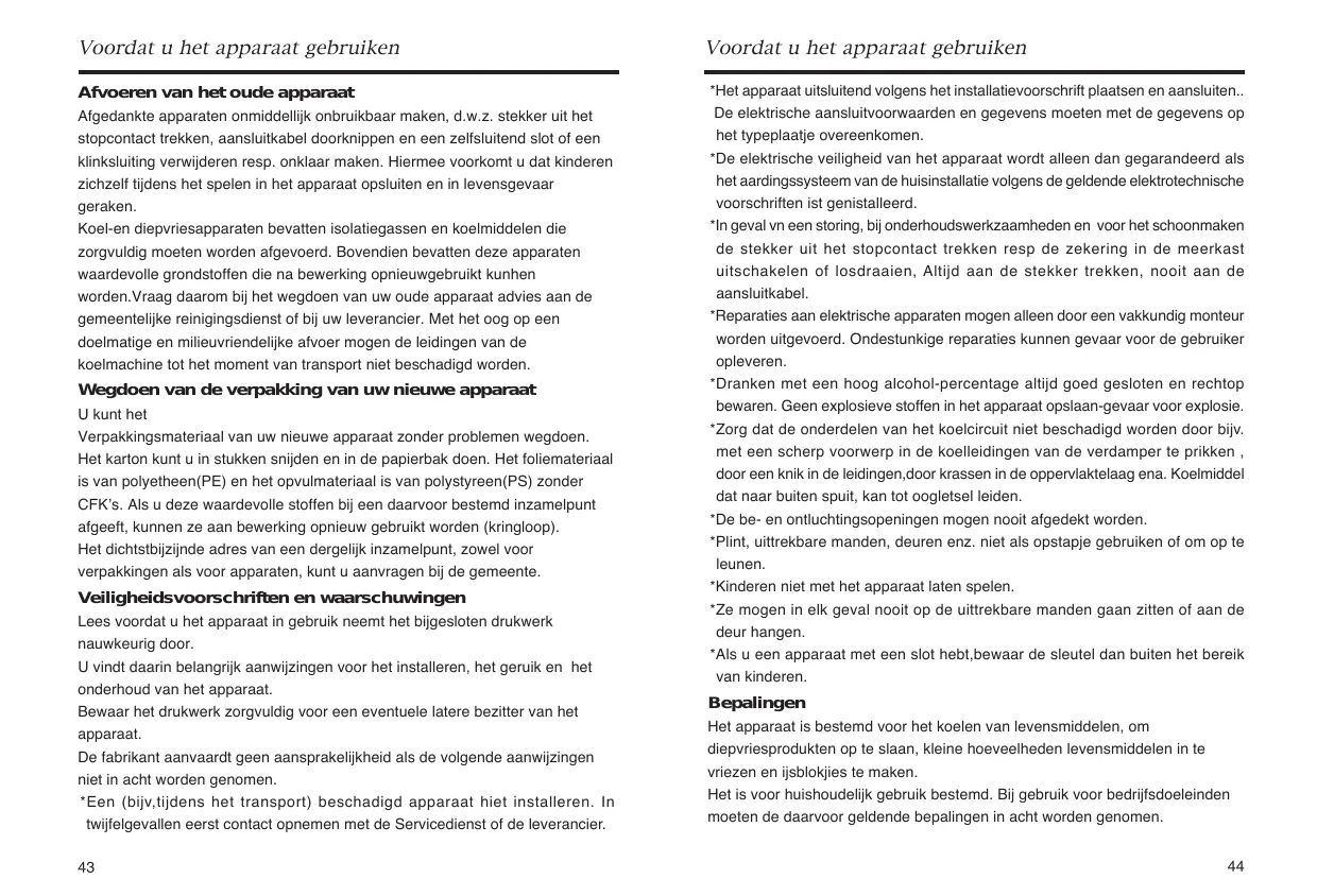 Voordat u het apparaat gebruiken Afvoeren van het oude apparaat Afgedankte apparaten onmiddellijk onbruikbaar maken, d.w.z. stekker uit het stopcontact trekken, aansluitkabel doorknippen en een zelfsluitend slot of een klinksluiting verwijderen resp. onklaar maken. Hiermee voorkomt u dat kinderen zichzelf tijdens het spelen in het apparaat opsluiten en in levensgevaar geraken. Koel-en diepvriesapparaten bevatten isolatiegassen en koelmiddelen die zorgvuldig moeten worden afgevoerd. Bovendien bevatten deze apparaten waardevolle grondstoffen die na bewerking opnieuwgebruikt kunhen worden.Vraag daarom bij het wegdoen van uw oude apparaat advies aan de gemeentelijke reinigingsdienst of bij uw leverancier. Met het oog op een doelmatige en milieuvriendelijke afvoer mogen de leidingen van de koelmachine tot het moment van transport niet beschadigd worden. Wegdoen van de verpakking van uw nieuwe apparaat U kunt het Verpakkingsmateriaal van uw nieuwe apparaat zonder problemen wegdoen. Het karton kunt u in stukken snijden en in de papierbak doen. Het foliemateriaal is van polyetheen(PE) en het opvulmateriaal is van polystyreen(PS) zonder CFK’s. Als u deze waardevolle stoffen bij een daarvoor bestemd inzamelpunt afgeeft, kunnen ze aan bewerking opnieuw gebruikt worden (kringloop). Het dichtstbijzijnde adres van een dergelijk inzamelpunt, zowel voor verpakkingen als voor apparaten, kunt u aanvragen bij de gemeente. Veiligheidsvoorschriften en waarschuwingen Lees voordat u het apparaat in gebruik neemt het bijgesloten drukwerk nauwkeurig door. U vindt daarin belangrijk aanwijzingen voor het installeren, het geruik en het onderhoud van het apparaat. Bewaar het drukwerk zorgvuldig voor een eventuele latere bezitter van het apparaat. De fabrikant aanvaardt geen aansprakelijkheid als de volgende aanwijzingen niet in acht worden genomen. *Een (bijv,tijdens het transport) beschadigd apparaat hiet installeren. In twijfelgevallen eerst contact opnemen met de Servicedienst of de leverancier.