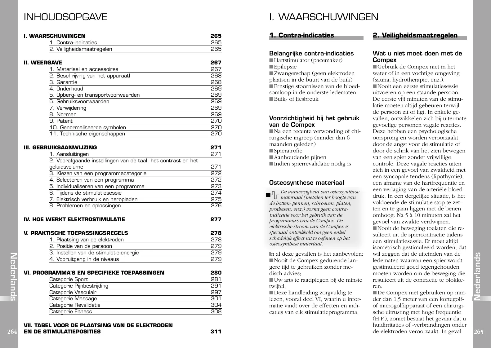 al deze gevallen is het aanbevolen: ■ Nooit de Compex gedurende lan- gere tijd te gebruiken zonder medisch advies; ■ Uw arts te raadplegen bij de minste twijfel; ■ Deze handleiding zorgvuldig te lezen, vooral deel VI, waarin u informatie vindt over de effecten en indicaties van elk stimulatieprogramma. ■ Gebruik de Compex niet in het water of in een vochtige omgeving (sauna, hydrotherapie, enz.). ■ Nooit een eerste stimulatiesessie uitvoeren op een staande persoon. De eerste vijf minuten van de stimulatie moeten altijd gebeuren terwijl de persoon zit of ligt. In enkele gevallen, ontwikkelen zich bij uitermate gevoelige personen vagale reacties. Deze hebben een psychologische oorsprong en worden veroorzaakt door de angst voor de stimulatie of door de schrik van het zien bewegen van een spier zonder vrijwillige controle. Deze vagale reacties uiten zich in een gevoel van zwakheid met een syncopale tendens (lipothymie), een afname van de hartfrequentie en een verlaging van de arteriële bloeddruk. In een dergelijke situatie, is het voldoende de stimulatie stop te zetten en te gaan liggen met de benen omhoog. Na 5 à 10 minuten zal het gevoel van zwakte verdwijnen. ■ Nooit de beweging toelaten die resulteert uit de spiercontractie tijdens een stimulatiesessie. Er moet altijd isometrisch gestimuleerd worden; dat wil zeggen dat de uiteinden van de ledematen waarvan een spier wordt gestimuleerd goed tegengehouden moeten worden om de beweging die resulteert uit de contractie te blokkeren. ■ De Compex niet gebruiken op minder dan 1,5 meter van een kortegolfof microgolfapparaat of een chirurgische uitrusting met hoge frequentie (H.F.), zoniet bestaat het gevaar dat u huidirritaties of -verbrandingen onder de elektroden veroorzaakt. In geval Nederlands INHOUDSOPGAVE