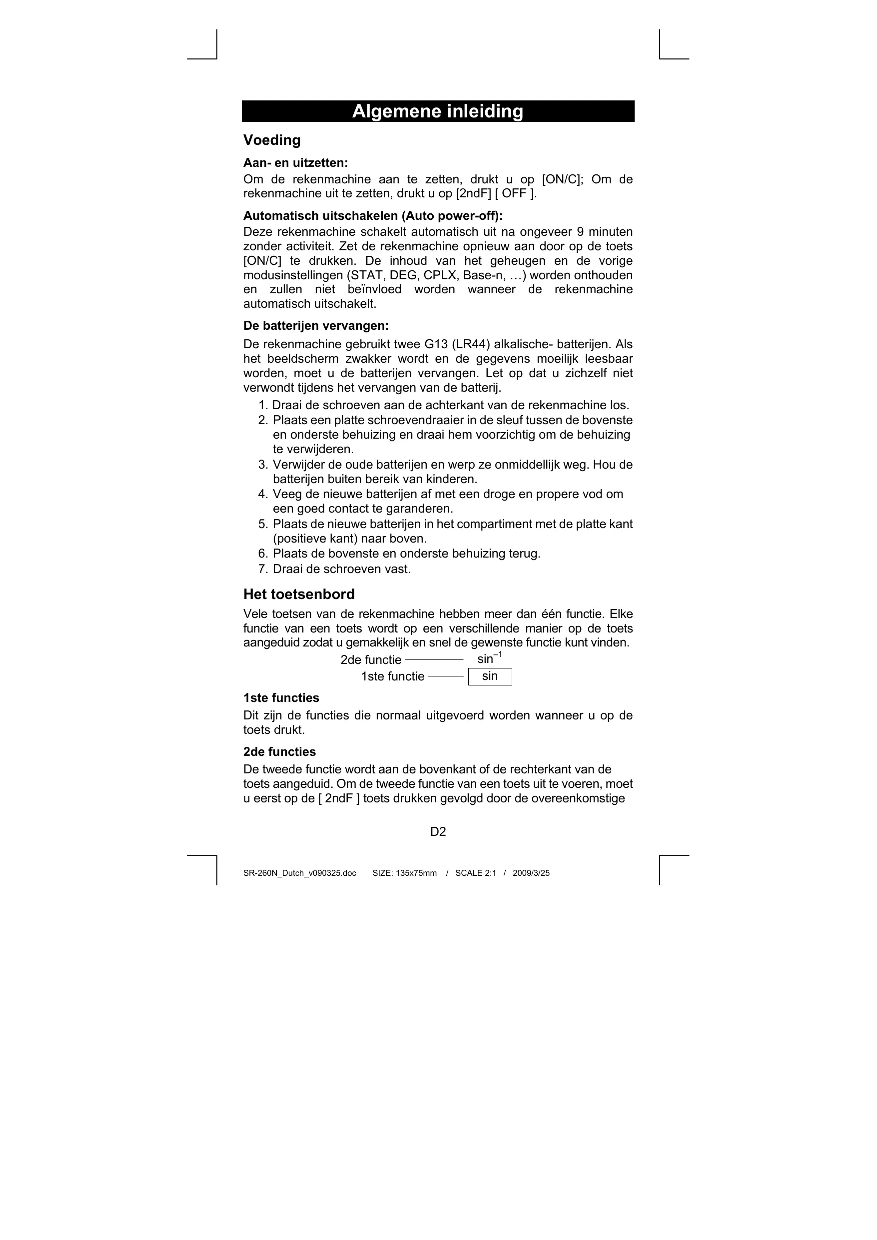 SR-260N_Dutch_v090325.doc SIZE: 135x75mm / SCALE 2:1 / 2009/3/25 Algemene inleiding Voeding Aan- en uitzetten: Om de rekenmachine aan te zetten, drukt u op [ON/C]; Om de rekenmachine uit te zetten, drukt u op [2ndF] [ OFF ]. Automatisch uitschakelen (Auto power-off): Deze rekenmachine schakelt automatisch uit na ongeveer 9 minuten zonder activiteit. Zet de rekenmachine opnieuw aan door op de toets [ON/C] te drukken. De inhoud van het geheugen en de vorige modusinstellingen (STAT, DEG, CPLX, Base-n, …) worden onthouden en zullen niet beïnvloed worden wanneer de rekenmachine automatisch uitschakelt. De batterijen vervangen: De rekenmachine gebruikt twee G13 (LR44) alkalische- batterijen. Als het beeldscherm zwakker wordt en de gegevens moeilijk leesbaar worden, moet u de batterijen vervangen. Let op dat u zichzelf niet verwondt tijdens het vervangen van de batterij.