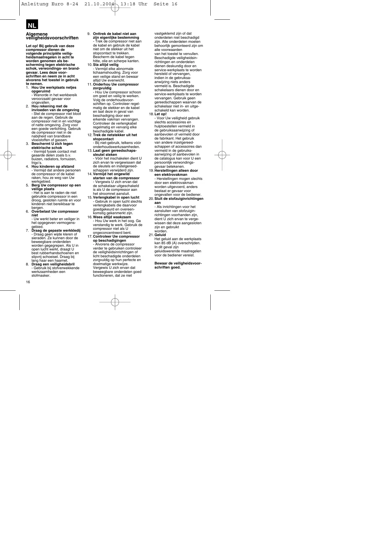 9. Onttrek de kabel niet aan zijn eigenlijke bestemming - Trek de compressor niet aan de kabel en gebruik de kabel niet om de stekker uit het stopcontact te trekken. Bescherm de kabel tegen hitte, olie en scherpe kanten. 10. Sta altijd veilig - Vermijd elke abnormale lichaamshouding. Zorg voor een veilige stand en bewaar altijd Uw evenwicht. 11. Onderhou Uw compressor zorgvuldig - Hou Uw compressor schoon om goed en veilig te werken. Volg de onderhoudsvoorschiften op. Controleer regelmatig de stekker en de kabel en laat deze in geval van beschadiging door een erkende vakman vervangen. Controleer de verlengkabel regelmatig en vervang elke beschadigde kabel. 12. Trek de netstekker uit het stopcontact - Bij niet-gebruik, telkens vóór onderhoudswerkzaamheden. 13. Laat geen gereedschapssleutel steken - Vóór het inschakelen dient U zich ervan te vergewissen dat de sleutels en instelgereedschappen verwijderd zijn. 14. Vermijd het ongewild starten van de compressor - Vergewis U zich ervan dat de schakelaar uitgeschakeld is als U de compressor aan het stroomnet aansluit. 15. Verlengkabel in open lucht - Gebruik in open lucht slechts verlengkabels die daarvoor goedgekeurd en overeenkomstig gekenmerkt zijn. 16. Wees altijd waakzaam - Hou Uw werk in het oog. Ga verstandig te werk. Gebruik de compressor niet als U ongeconcentreerd bent. 17. Controleer Uw compressor op beschadigingen - Alvorens de compressor verder te gebruiken controleer de veiligheidsinrichtingen of licht beschadigde onderdelen zorgvuldig op hun perfecte en doelmatige werkwijze. Vergewis U zich ervan dat beweegbare onderdelen goed functioneren, dat ze niet