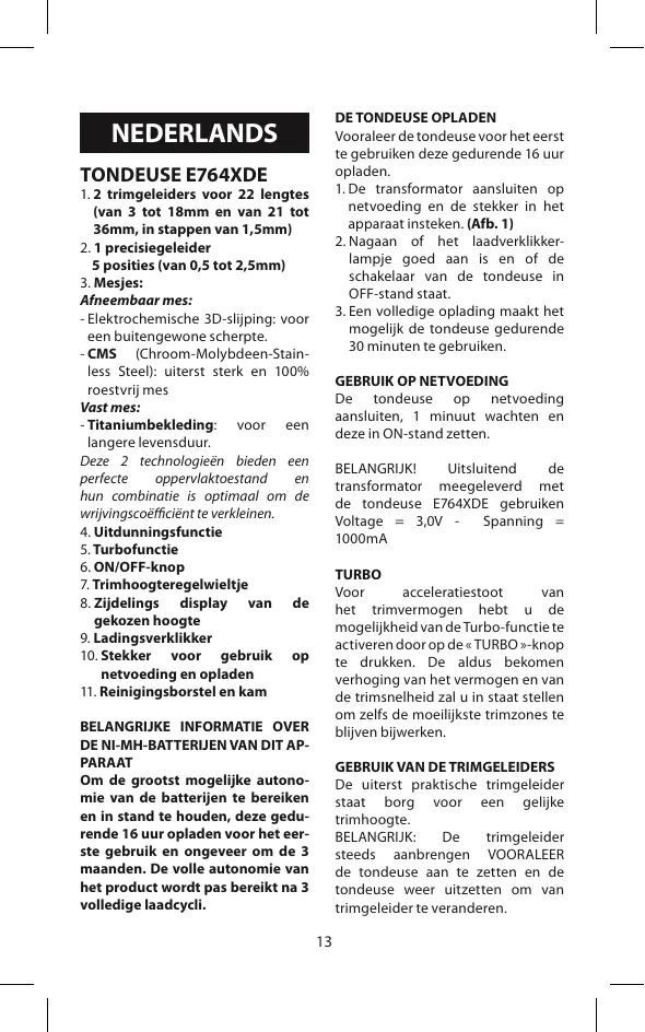 De tondeuse op netvoeding aansluiten, 1 minuut wachten en deze in ON-stand zetten. BELANGRIJK! Uitsluitend transformator meegeleverd met de tondeuse E764XDE gebruiken Voltage = 3,0V Spanning = 1000mA TURBO Voor acceleratiestoot van het trimvermogen hebt u de mogelijkheid van de Turbo-functie te activeren door op de « TURBO »-knop te drukken. De aldus bekomen verhoging van het vermogen en van de trimsnelheid zal u in staat stellen om zelfs de moeilijkste trimzones te blijven bijwerken.