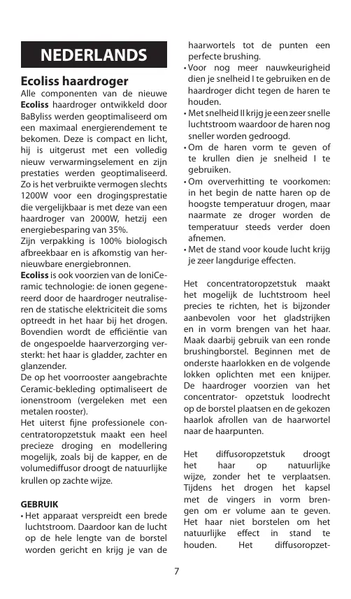 Alle componenten van de nieuwe Ecoliss haardroger ontwikkeld door BaByliss werden geoptimaliseerd om een maximaal energierendement te bekomen. Deze is compact en licht, hij is uitgerust met een volledig nieuw verwarmingselement en zijn prestaties werden geoptimaliseerd. Zo is het verbruikte vermogen slechts 1200W voor een drogingsprestatie die vergelijkbaar is met deze van een haardroger van 2000W, hetzij een energiebesparing van 35%. Zijn verpakking is 100% biologisch afbreekbaar en is afkomstig van hernieuwbare energiebronnen. Ecoliss is ook voorzien van de IoniCeramic technologie: de ionen gegenereerd door de haardroger neutraliseren de statische elektriciteit die soms optreedt in het haar bij het drogen. Bovendien wordt de efficiëntie van de ongespoelde haarverzorging versterkt: het haar is gladder, zachter en glanzender. De op het voorrooster aangebrachte Ceramic-bekleding optimaliseert de ionenstroom (vergeleken met een metalen rooster). Het uiterst fijne professionele concentratoropzetstuk maakt een heel precieze droging en modellering mogelijk, zoals bij de kapper, en de volumediffusor droogt de natuurlijke krullen op zachte wijze.