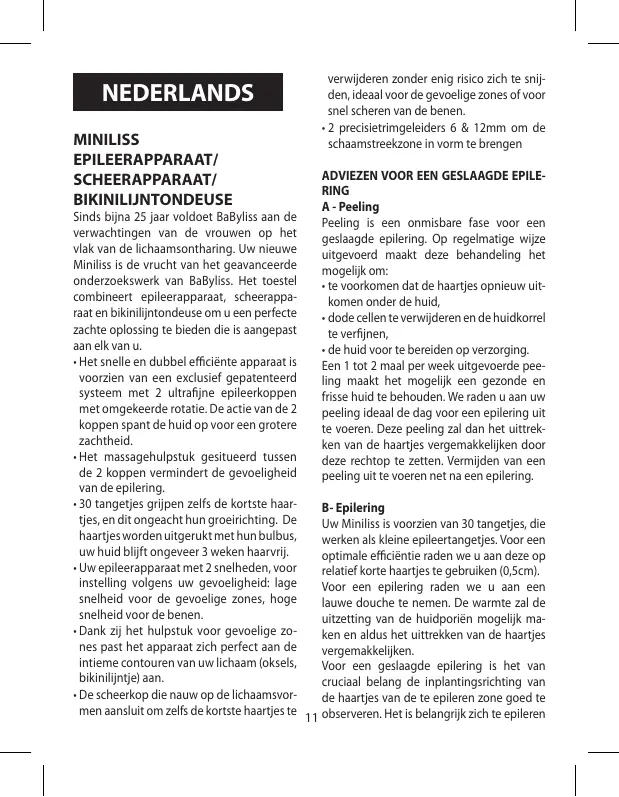 NEDERLANDS MINILISS EPILEERAPPARAAT/ SCHEERAPPARAAT/ BIKINILUNTONDEUSE Sinds bijna 25 jaar voldoet BaBylss aan de verwachtingen van de vrouwen op het vlak van de lichaamsontharing. Uw nieuvre Miniliss is de vrucht van het geavanceerde onderzoekswerk van BaBiss. Het toestel