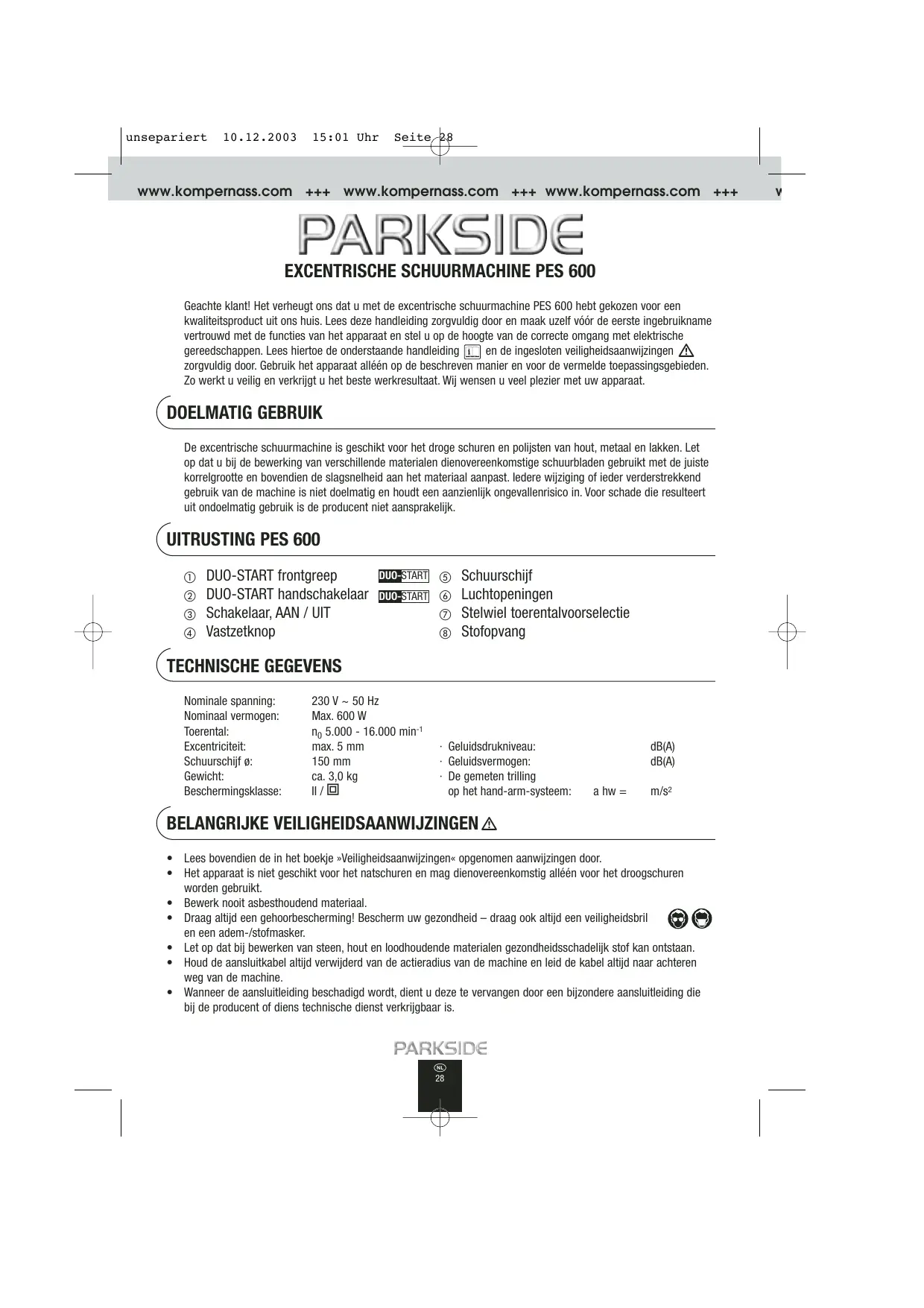 GEBRUIKSAANWIJZING KH 3120 RANDOM ORBITAL SANDER PARKSIDE