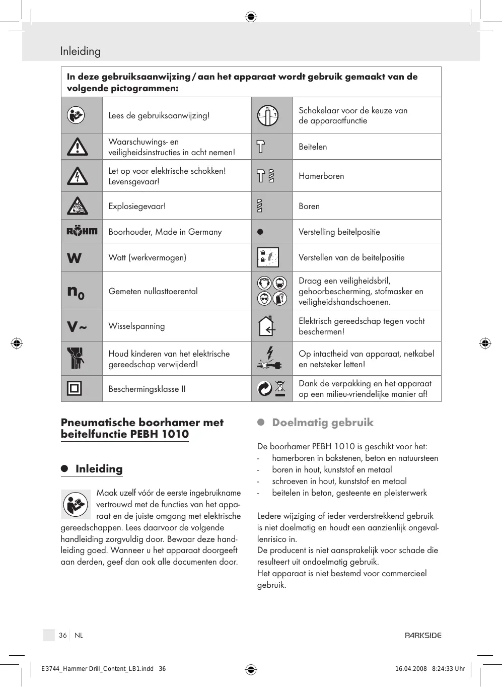 GEBRUIKSAANWIJZING PEBH 1010 PARKSIDE