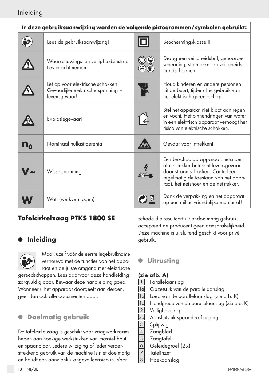 Dank de verpakking en het apparaat op een milieuvriendelike manier afl Tafelcirkelzaag PTKS 1800 SE © Inleiding Mack uzelf véér de eerste ingebruikname vertrouwd met de functies van het appa- raat en de juiste omgang met elektrische gereedschappen. Lees daarvoor deze handleiding zorgvuldig door. Bewaar deze handleiding goed. Wanneer u het apparaat doorgeeft aan derden, geef dan ook alle documenten door. © Doelmatig gebruik De tafelcirkelzaag is geschikt voor zaagwerkzaam- heden aan hoekige werkstukken van massief hout en spaanplaat. Ledere wijziging of ieder verder- strekkend gebruïk van de machine is niet doelmatig en houdi een aanzienlik ongevallenrisico in. Voor 18 NI/BE schade die resulteert uit ondoelmatig gebruik, accepteert de producent geen aansprakelikheid. Deze machine is uitsluitend geschikt voor privé gebruik. © Litrusting {zie afb. A) Parallelaanslag Opzetstuk van de parallelaanslag Loep van de parallelaanslag {zie afb. K) Handgreep van de parallelaanslag (zie afb. K) Veiligheidskap Aansluitstuk spaanderafzuiging Splitwig Zaagblad Zaagtafel Geleidegroef [2x] Tafelinzet Hoekaanslag PARKSIDE