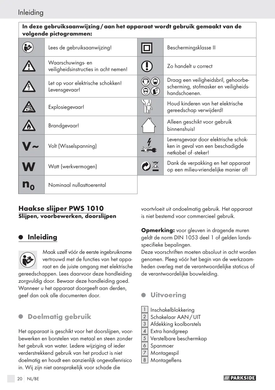 Inleiding volgende pictogrammen: In deze gebruiksaanwijzing / aan het apparaat wordt gebruik gemaakt van de Lees de gebruïksaanwijzingl Beschermingsklasse II Waarschuwings- en veiligheidsinstructies in acht nemenl Zo handelt u correct Let op voor elektrische schokken! Levensgevaarl Draag een veiligheïdsbri, gehoorbe- scherming, stofmasker en veiligheids- handschoenen. Explosiegevaarl Houd kinderen van het elektrische gereedschap verwiderdl Brandgevaarl Alleen geschikt voor gebruik binnenshuis! Volt (Wisselspanning) Levensgevaar door elektrische schok- Ken in geval van een beschadigde netkabel of -stekerl Watt (werkvermogen) Dank de verpakking en het apparaat op een milieuxriendelike manier afl Q r-LEe8e [=] Nominaal nullastoerental Haakse slijper PWS 1010 Slpen, voorbewerken, doorslijpen Maak uzelf véér de eerste ingebruikname vertrouwd met de functies van het appa- raat en de juiste omgang met elektrische gereedschappen. Lees daarvoor deze handleiding zorgvuldig door. Bewaar deze handleiding goed. Wanneer u het apparaat doorgeeft aan derden, geef dan ook alle documenten door. © Doelmatig gebruik Het apparaat is geschikt voor het doorslijpen, voor- bewerken en borstelen van metaal en steen zonder het gebruik van water. Ledere wiziging of ieder verderstrekkend gebruik van het product is niet doelmatig en houdt een aanzienlik ongevallenrisico in. Wij zijn niet aansprakelik voor schade die 20 N/BE voortvloeit uit ondoelmatig gebruik. Het apparaat is niet bestemd voor commercieel gebruik. Opmerking: voor gleuven in dragende muren geldi de norm DIN 1053 deel 1 of gelden lands- specifieke bepalingen. Deze voorschriften moeten absoluut in acht worden genomen. Pleeg véér het begin van de werkzaam- heden overleg met de verantwoordelike staticus of de verantwoordelike bouwleiding. © Uitvoering [1] Inschakelblokkering Schakelaar AAN/ UIT Afdekking koolborstels Extra handgreep Verstelbare beschermkap [6] Spanmoer Montagespil Montageflens WA PARKSIDE