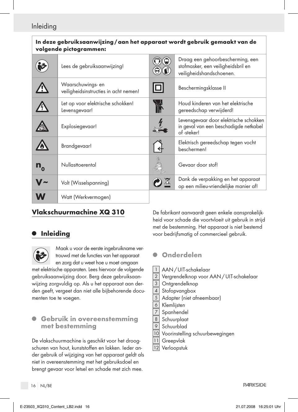 De garantie geldt alleen voor materiaal- of fabricagefouten, maar niet voor slijtage of voorbeschadigingen aan breekbare onderdelen, bijvoorbeeld schakelaars of accu’s. Het product is uitsluitend bestemd voor privé-gebruik en niet voor bedrijfsmatige doeleinden. Machinerichtlijn (98 / 37 / EG) Bij verkeerd gebruik en ondeskundige behandeling, bij gebruik van geweld en bij ingrepen die niet worden uitgevoerd door ons geautoriseerde servicefiliaal, vervalt de garantie. Uw wettelijke rechten worden door deze garantie niet beperkt. Wij, Kompernaß GmbH, Burgstr. 21, D-44867 Bochum, Duitsland, verklaren hiermee voor dit product de overeenstemming met de volgende EG-richtlijnen: EU-laagspanningsrichtlijn (2006 / 95 / EEG) Elektromagnetische tolerantie (2004 / 180 / EG) Type / Apparaatbeschrijving: Parkside vlakschuurmachine XQ 310 Bochum, 31.07.2008