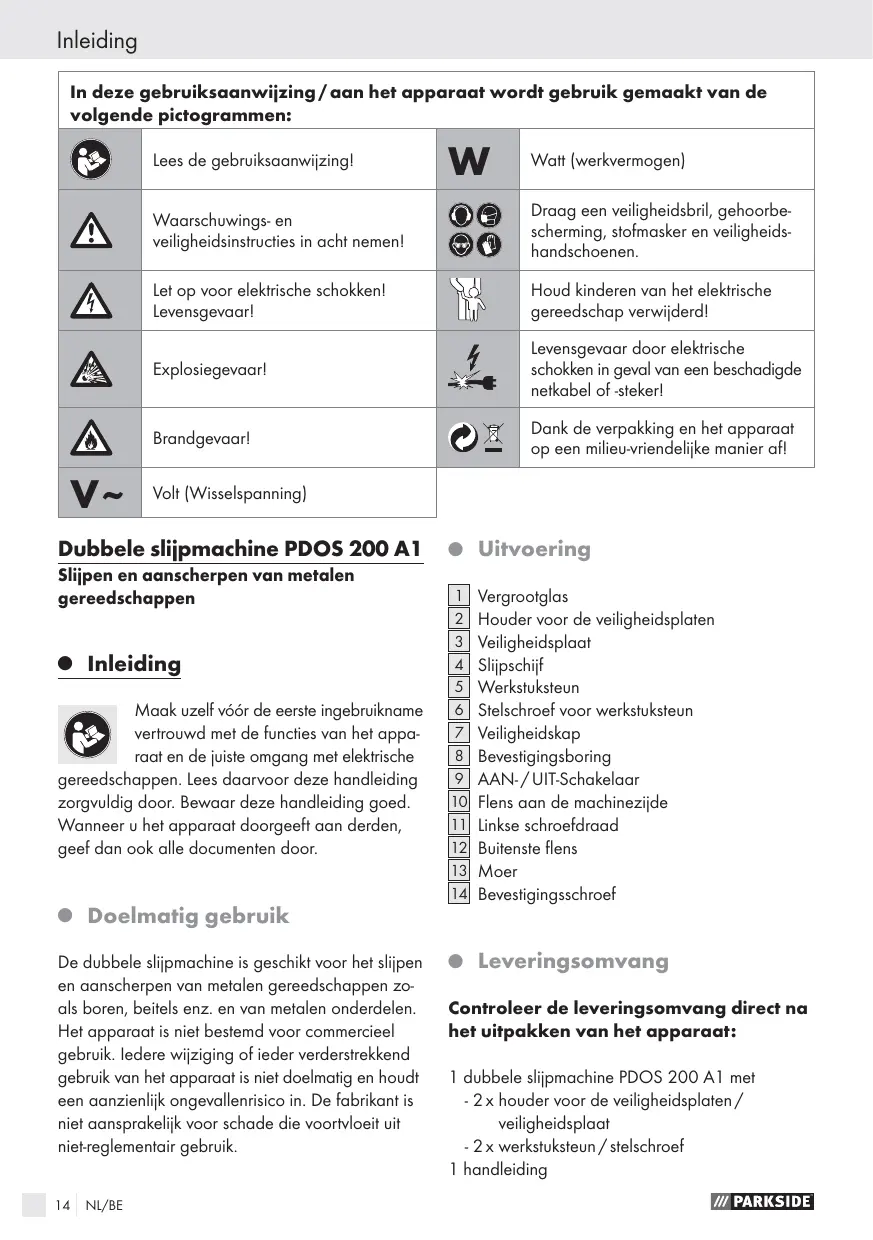 De dubbele slijpmachine is geschikt voor het slijpen en aanscherpen van metalen gereedschappen zo- als boren, beitels enz. en van metalen onderdelen. Het apparaat is niet bestemd voor commercieel gebruik. ledere wijziging of ieder verderstrekkend gebruik van het apparaat is niet doelmatig en houdt een aanzienlik ongevallenrisico in. De fabrikant is niet aansprakelijk voor schade die voortvloeit uit nietreglementair gebruik.