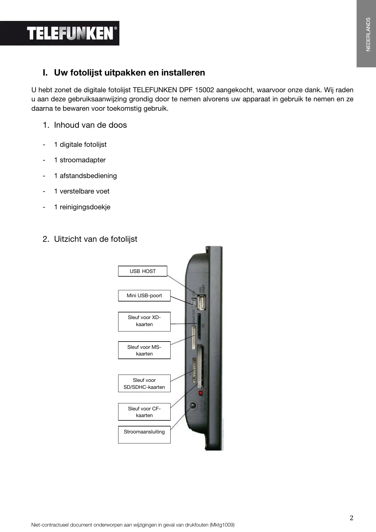 U hebt zonet de digitale fotolijst TELEFUNKEN DPF 15002 aangekocht, waaroor onsze dank. Wij raden u aan deze gebruiksaanwijzing grondig door te nemen alvorens uw apparaat in gebruik te nemen en ze daarna te bewaren voor toekomstig gebruik.
