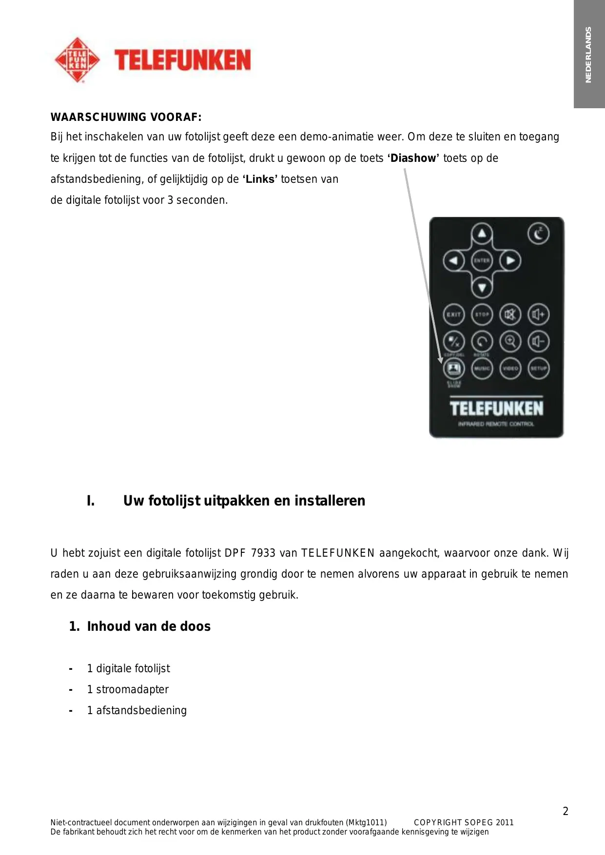 U hebt zojuist een digitale fotolijst DPF 7933 van TELEFUNKEN aangekocht, waaroor unsere dank. Wij raden u aan deze gebruiksaanwijzing grondig door te nemen alvorens uw apparaat in gebruik te nemen en ze daarna te bewaren voor toekomstig gebruik.